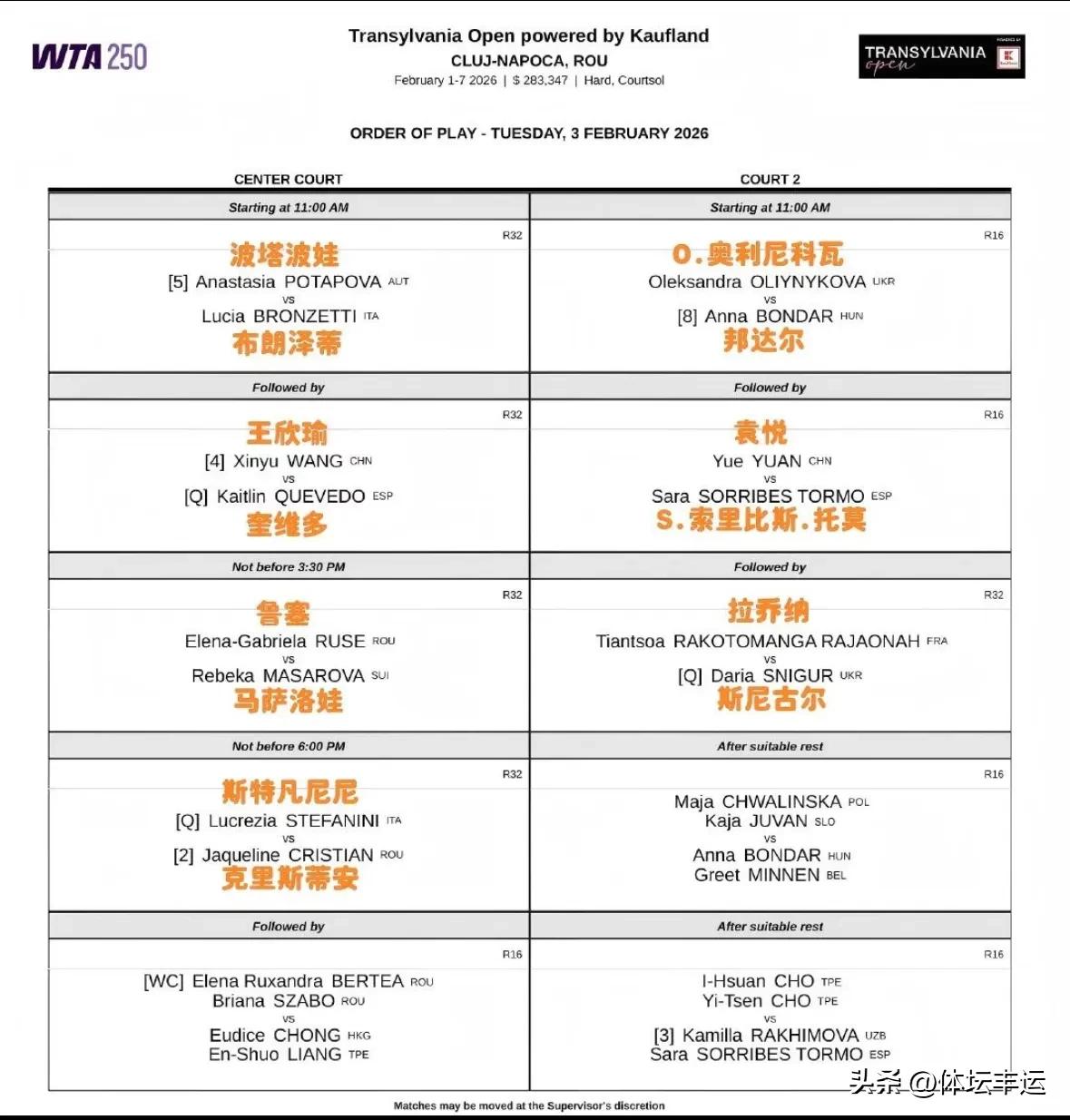 WTA250罗马尼亚克鲁日-纳波卡站首轮战报,排序接昨日,北京时间3日12、18:30✅4号种子中国王欣瑜vs资格赛选手西班牙科维多;