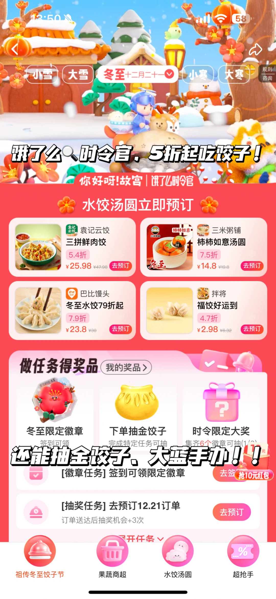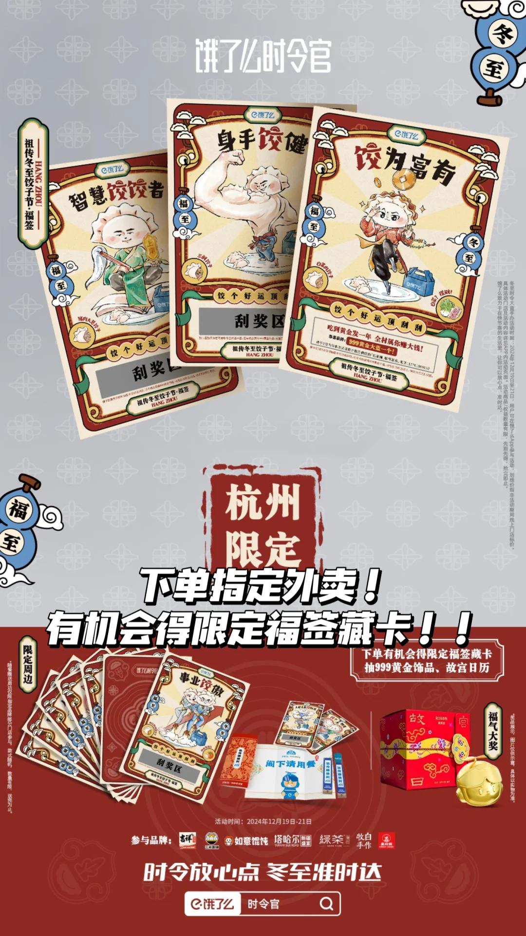 12.21日冬至当天!!还能有3️⃣万份大牌免单!!一起上饿了么支持饺子申遗进入专属会场,还有额外1万份饺子免单和千万份红包大礼!!🤩
