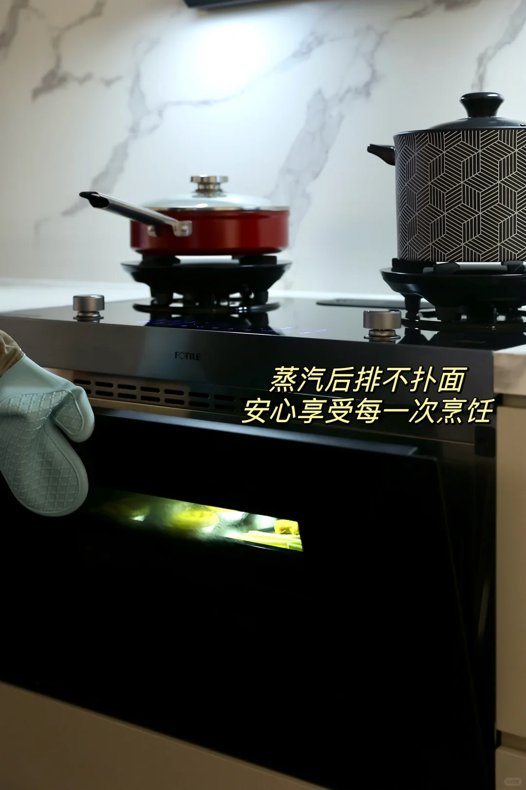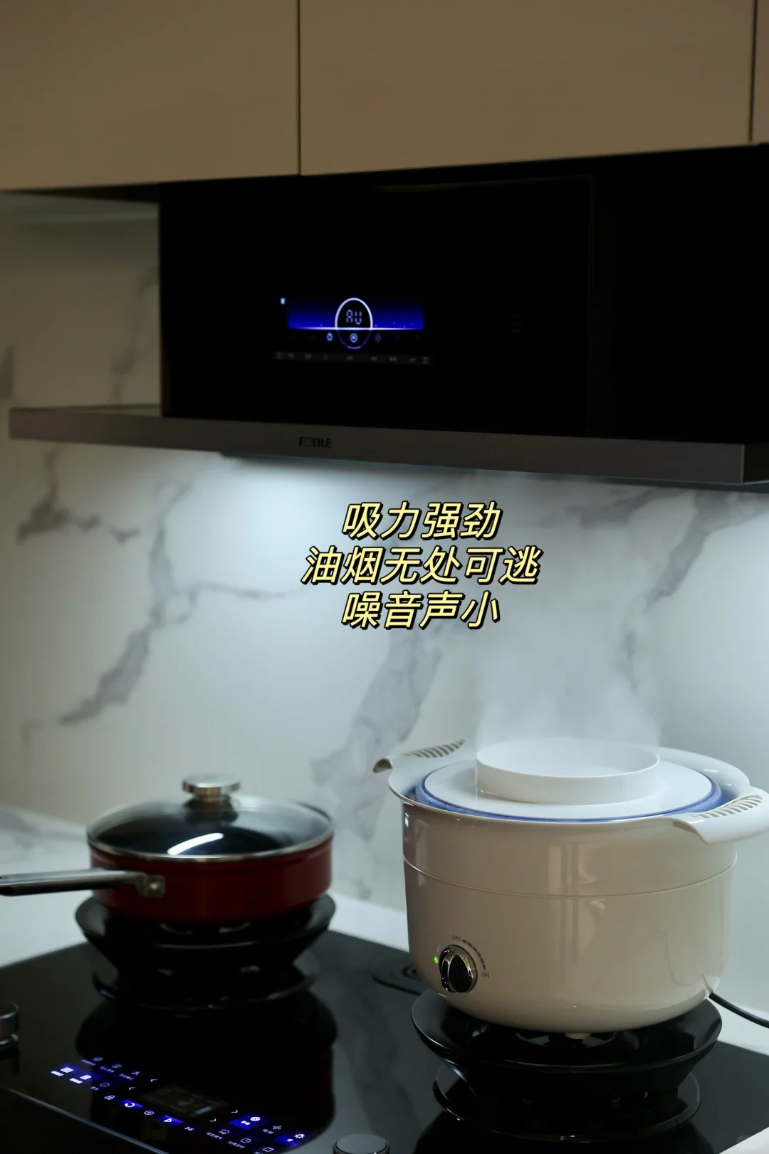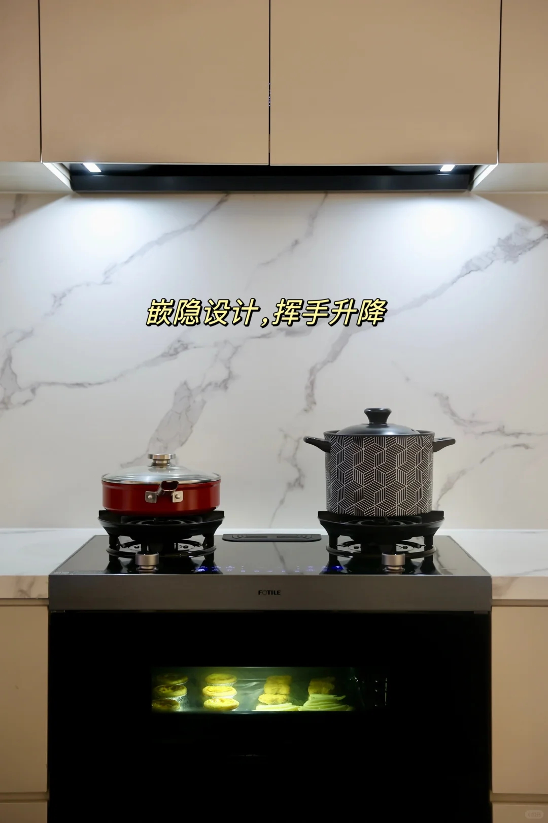 嵌隐式设计,挥手👋🏻可以操控烟机升降,灵敏方便,炒菜过程中也能调节高度,再也不用担心油烟沾染到衣服和脸上了,猛火🔥爆炒,小火慢炖,中式烹饪一点压力都没有,噪音也很小,就连蒸汽都做的后排设计,开门不会热气扑面,安全感满满。
