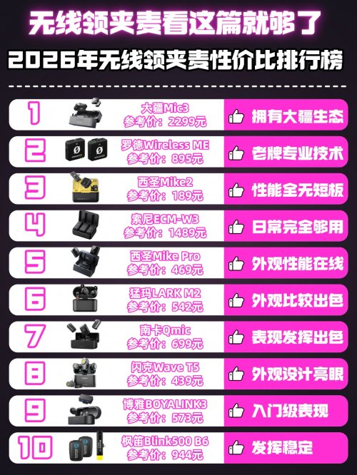 选对领夹麦真的能少走很多弯路,不仅能省下大量后期时间,作品的音频质感也能肉眼可见地提升。这份2026年品牌推荐榜单,从百元平价款到专业旗舰级全都覆盖了。不管你是刚入门的新手,还是想升级设备的资深创作者,都能在里面找到适配自己需求的那一款。