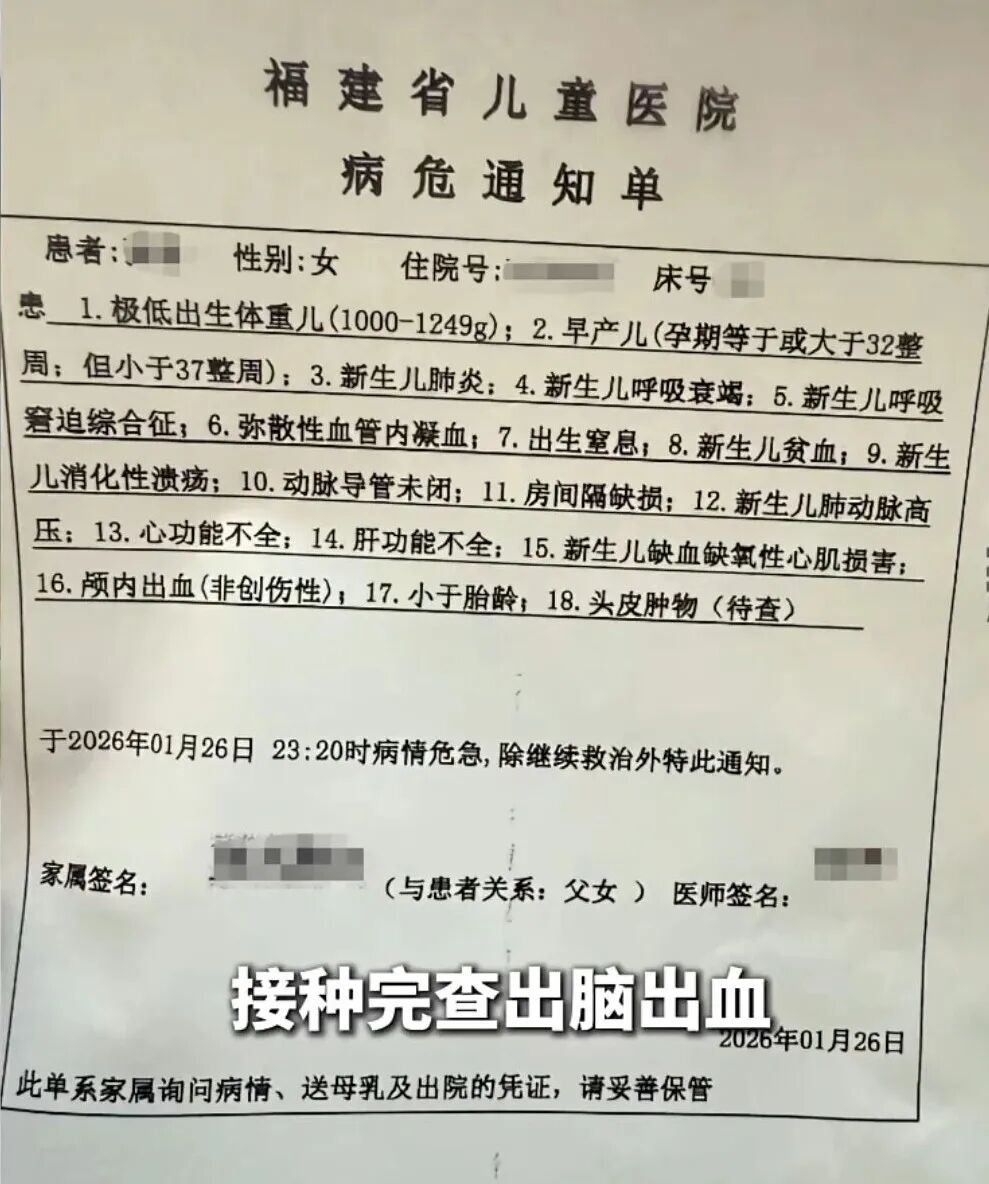2月11日消息, 福建莆田一早产儿疑因医院违规接种疫苗致脑出血呼吸衰竭。