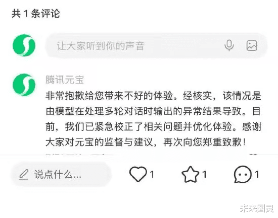 针对此事,元宝官方在相关帖子下回应称,非常抱歉给用户带来不好的体验,经核实该情况是模型处理多轮对话时出现的异常输出导致,目前已紧急校正相关问题、优化使用体验,并向用户郑重致歉。