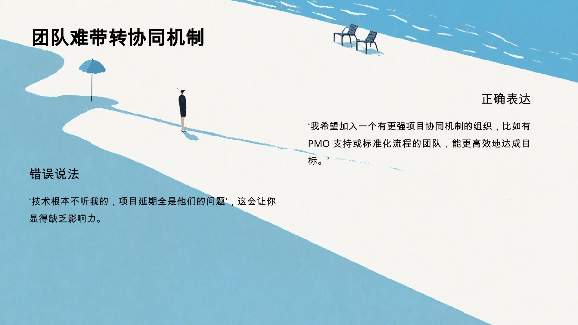 为什么不行:PM 的核心能力是 “无权力领导”,你说 “推不动”,等于承认自己缺乏沟通协调能力。