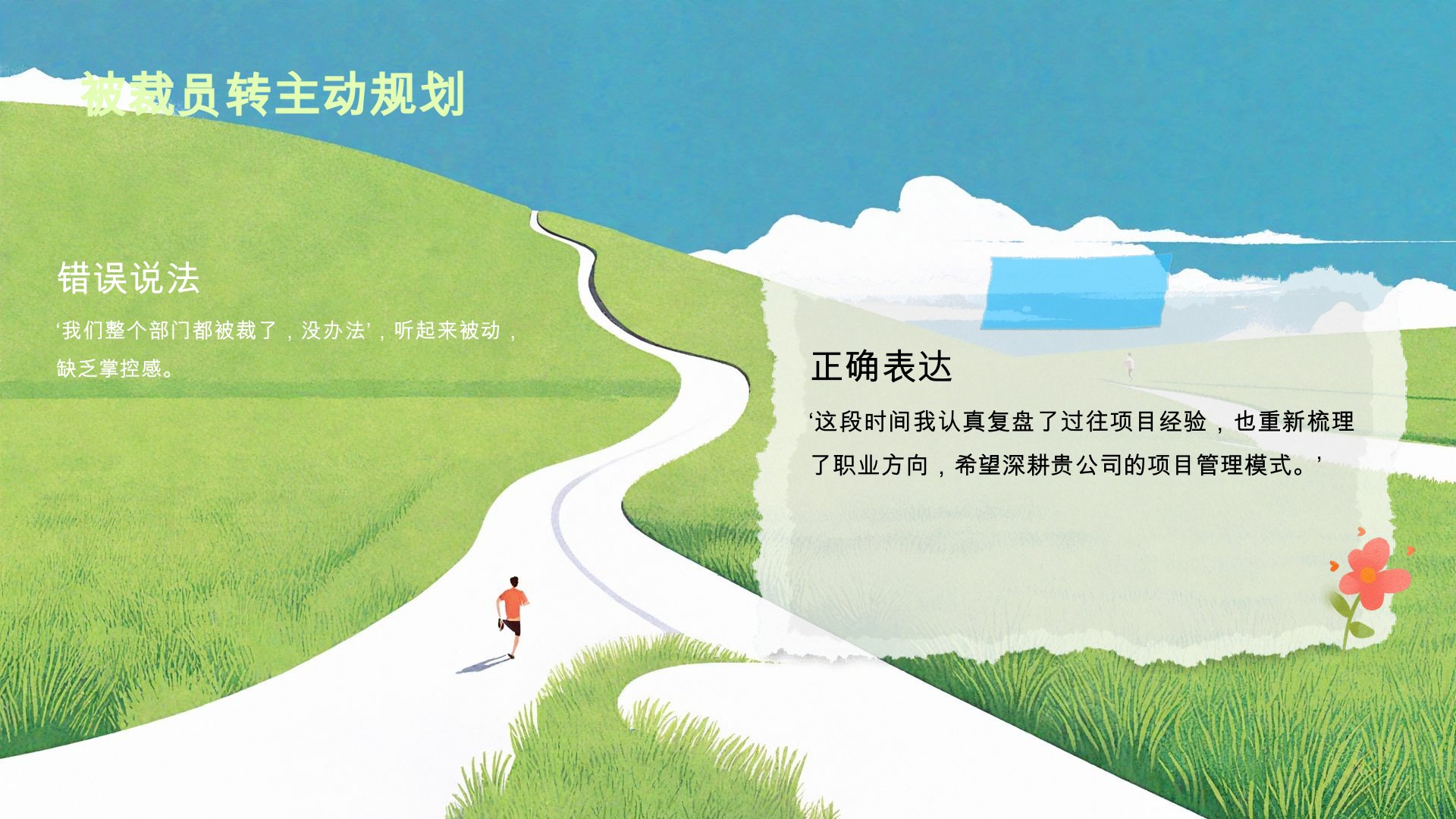 加分说法:“由于公司战略调整,我所在的项目方向被暂停,团队也随之裁撤。这段时间我复盘了过往项目中的风险管理、跨部门协作经验,也明确了未来想深耕的领域 —— 贵公司在 XX 行业的项目布局和标准化管理模式,正好和我的职业规划高度契合,希望能有机会加入,发挥自己的积累。”