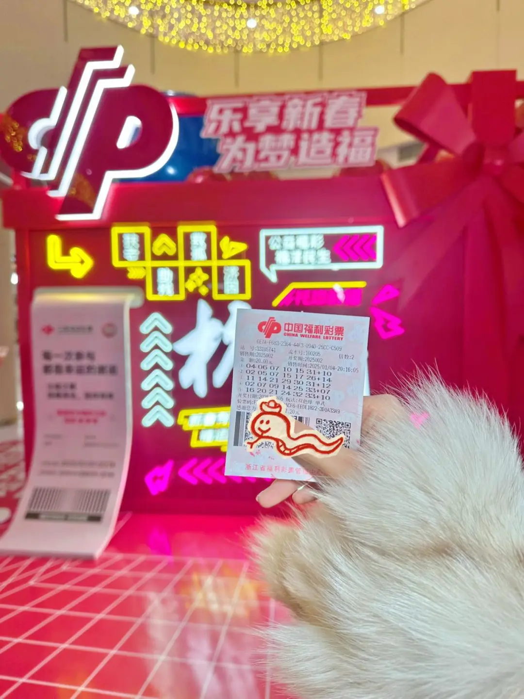 新年的第一支彩🎫 和朋友周末去中大银泰百货吃海底捞 偶遇乐享新春 为梦造福。 满满的春节氛围——写福字、拳击🥊、大转盘、扭蛋、抽🎁~春联、蛇年玩偶、环保袋~ 整个期待住了! 买了20的彩🎫、送了20的券、抽奖还抽到了20~ 白喝了两杯奶茶哈哈哈!!真的好开心呀!!
