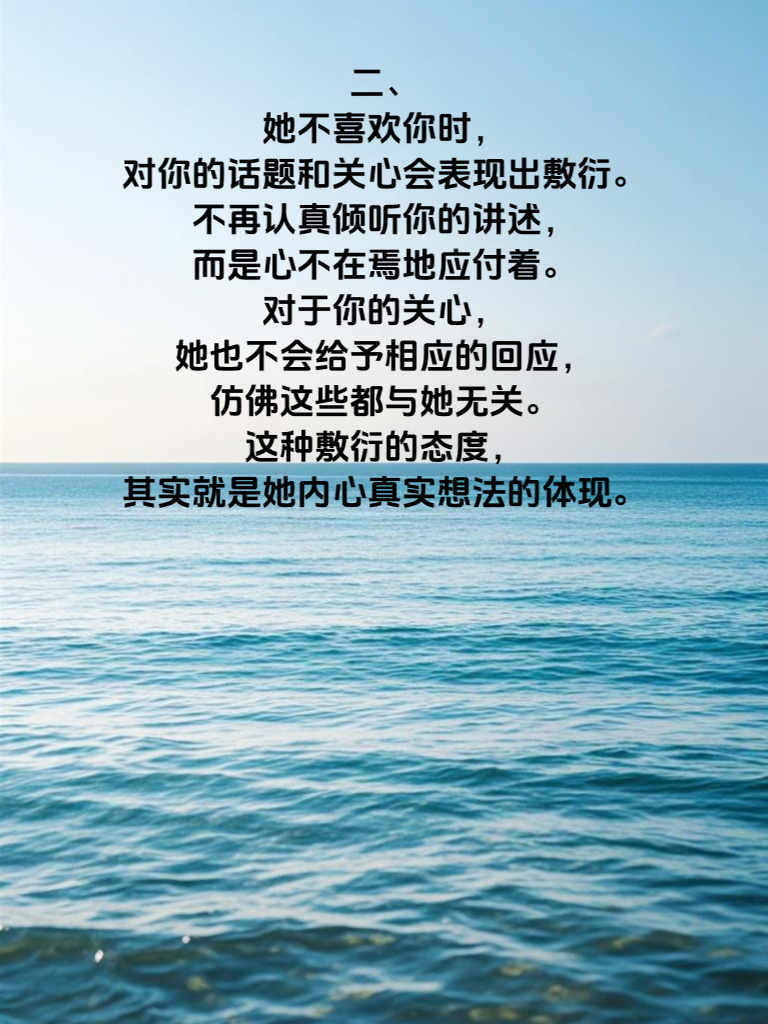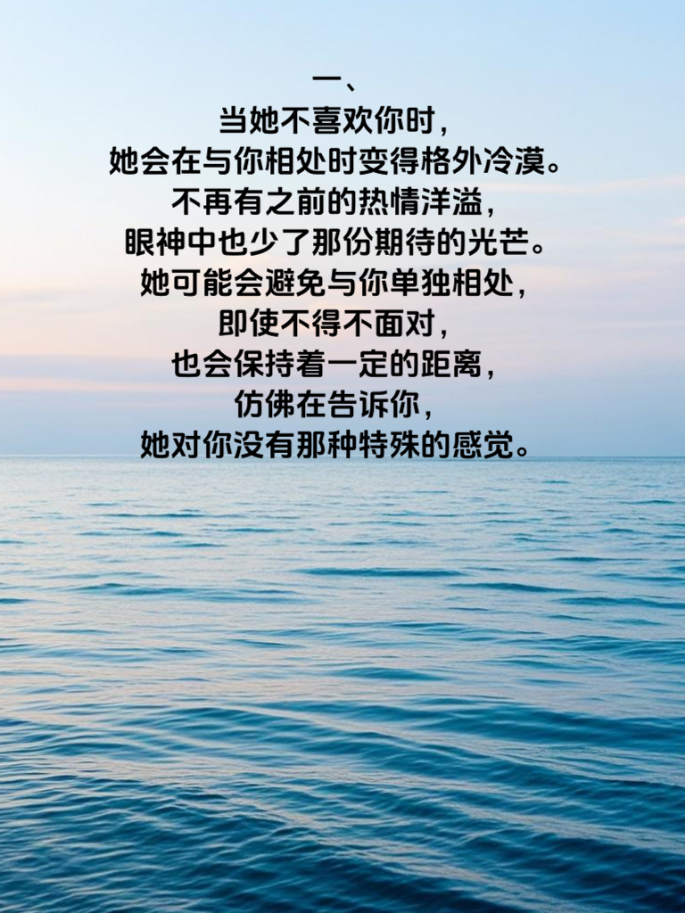 一、当她不喜欢你时,她会在与你相处时变得格外冷漠。不再有之前的热情洋溢,眼神中也少了那份期待的光芒。她可能会避免与你单独相处,即使不得不面对,也会保持着一定的距离,仿佛在告诉你,她对你没有那种特殊的感觉。 二、她不喜欢你时,对你的话题和关心会表现出敷衍。不再认真倾听你的讲述,而是心不在焉地应付着。对于你的关心,她也不会给予相应的回应,仿佛这些都与她无关。这种敷衍的态度,其实就是她内心真实想法的体现。 三、她不喜欢你的话,在言行举止上会变得更加谨慎。不会轻易地露出自己的真实情绪,总是小心翼翼地隐藏着自己的内心世界。她可能会刻意避免与你有过多的肢体接触,因为她不想给你任何错误的信号。这些隐藏的信号,需要我们用心去观察和体会,才能真正读懂她的心思。