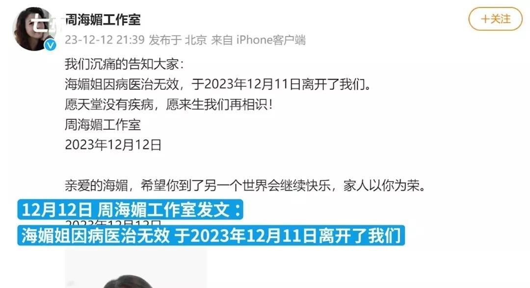著名演员周海媚因病去世,年仅57岁,周海媚工作室发文:愿来生再相识。 著名演员