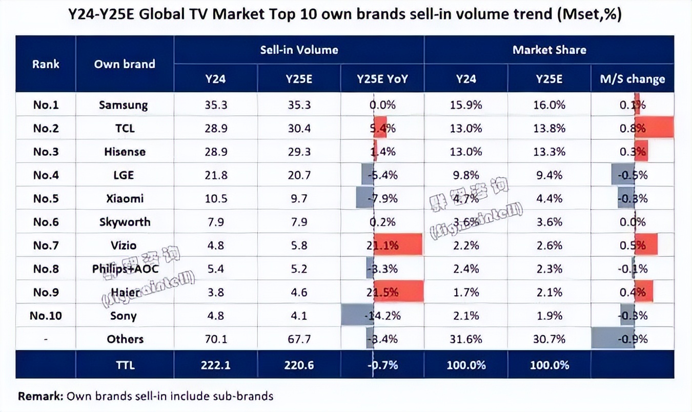 在 2025 年的全球电视出货量排名中,除了三星是韩国企业、Vizio 是美国企业之外,从第二名的 TCL 到第九名的海尔,全部都是中国企业。