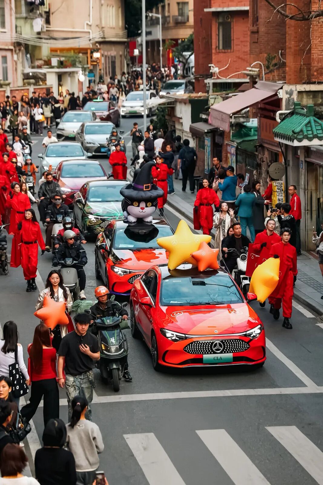 品牌此次活动突破以往传统车展的静态展示,引入“花车巡游”这一动态事件元素,由CLA花车与CLA痛车组成的车队,在固定时段穿梭街区,配合NPC互动,形成移动的视觉焦点和话题事件。巡游这一环节扩大了品牌曝光度,并吸引街区流动人群的加入,形成二次传播。