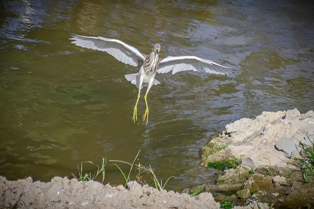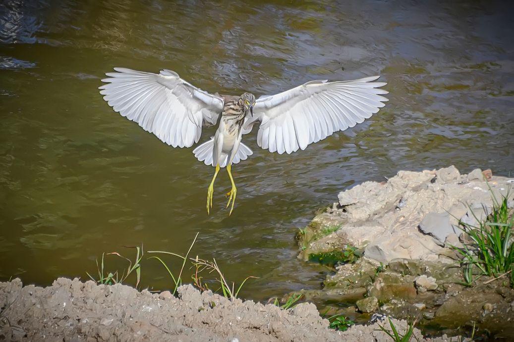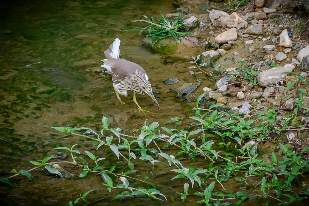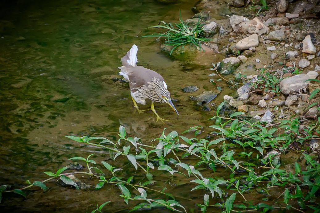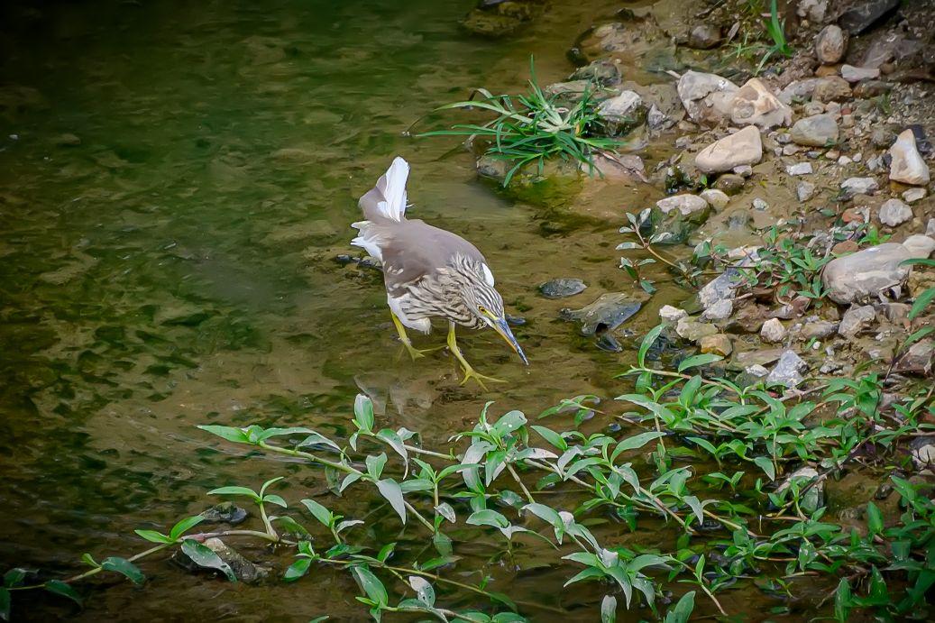 海南保亭凌水河上的池鹭。池鹭,鹳形目鹭科池鹭属鸟类。繁殖期头及颈深栗色,胸酱紫色;非繁殖期背部褐色,头、颈、上胸部具褐色纵纹,下腹部及翼为白色;嘴基黄而尖端黑色,跗趾黄色。非繁殖期飞行时因白色的腹部和飞羽,易与白鹭混淆,背部有深色阴影是其分辨特征。池鹭主要分布在东亚温带、亚热带地区和中国。栖息在浅水和咸水湿地和池塘。低地鸟类,活动范围被北部的亚北极地区、西部和南部的山脉所限。常在白昼或展昏活动,站在水边或浅水中,用嘴飞快地攫食,通常无声,争吵时发出低沉的呱呱叫声。食物包括昆虫、鱼和甲壳类动物。繁殖期为每年的