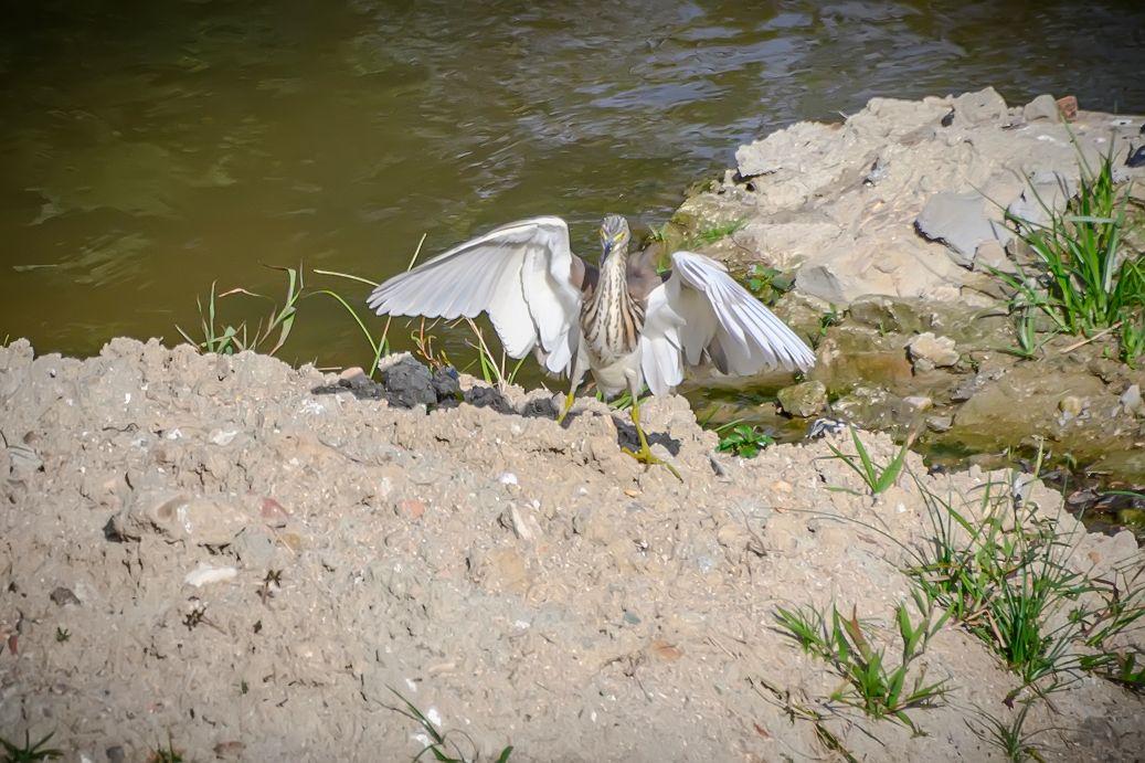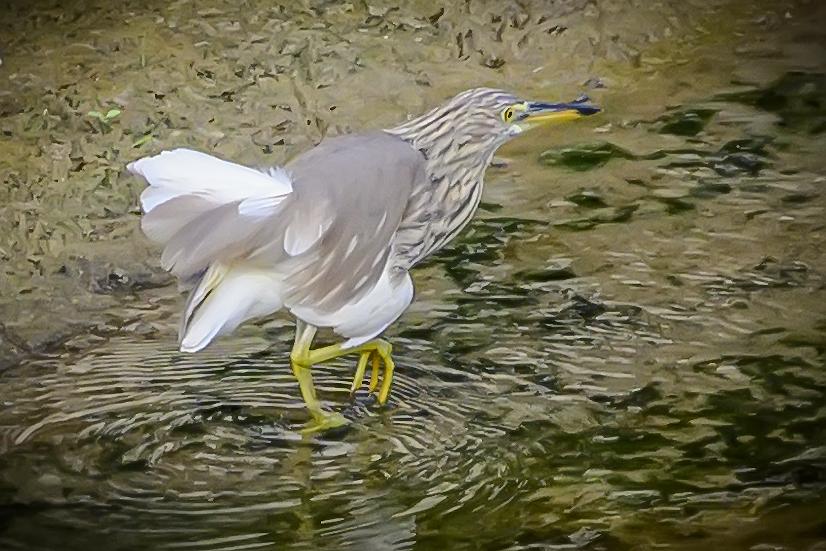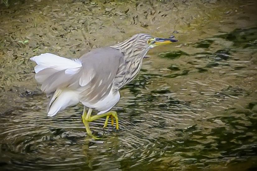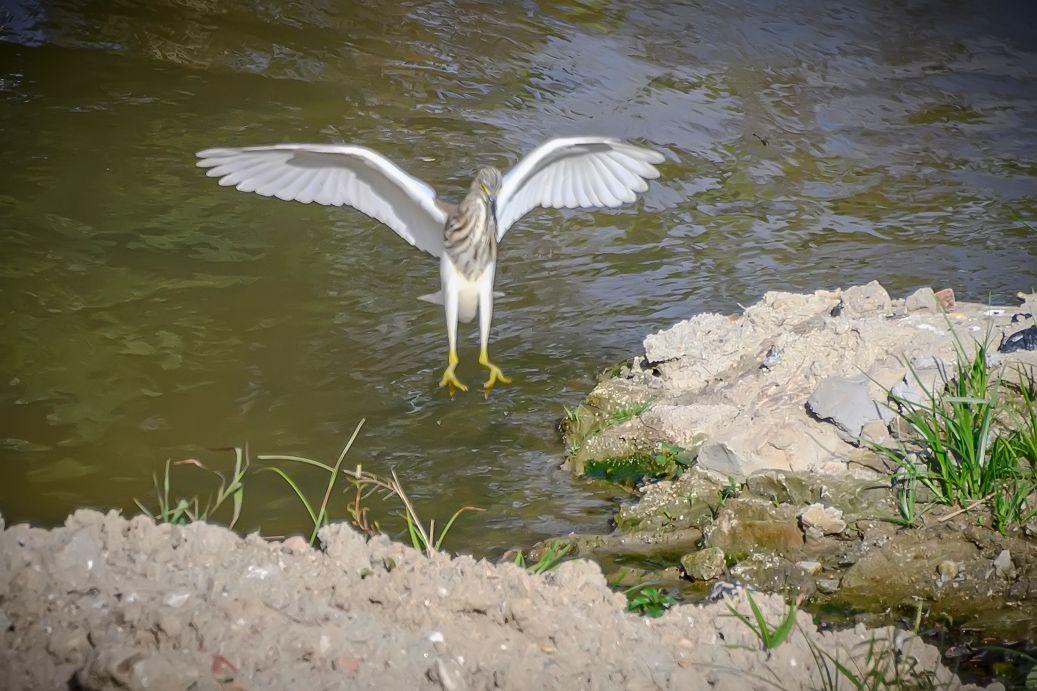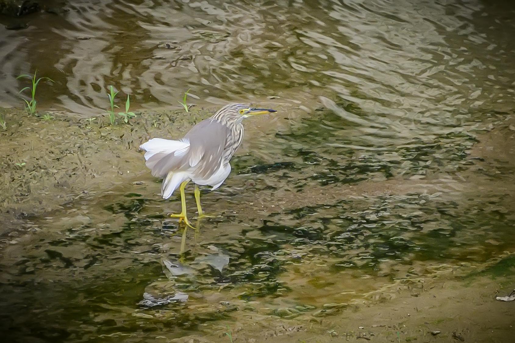 海南保亭凌水河上的池鹭。池鹭,鹳形目鹭科池鹭属鸟类。繁殖期头及颈深栗色,胸酱紫色;非繁殖期背部褐色,头、颈、上胸部具褐色纵纹,下腹部及翼为白色;嘴基黄而尖端黑色,跗趾黄色。非繁殖期飞行时因白色的腹部和飞羽,易与白鹭混淆,背部有深色阴影是其分辨特征。池鹭主要分布在东亚温带、亚热带地区和中国。栖息在浅水和咸水湿地和池塘。低地鸟类,活动范围被北部的亚北极地区、西部和南部的山脉所限。常在白昼或展昏活动,站在水边或浅水中,用嘴飞快地攫食,通常无声,争吵时发出低沉的呱呱叫声。食物包括昆虫、鱼和甲壳类动物。繁殖期为每年的
