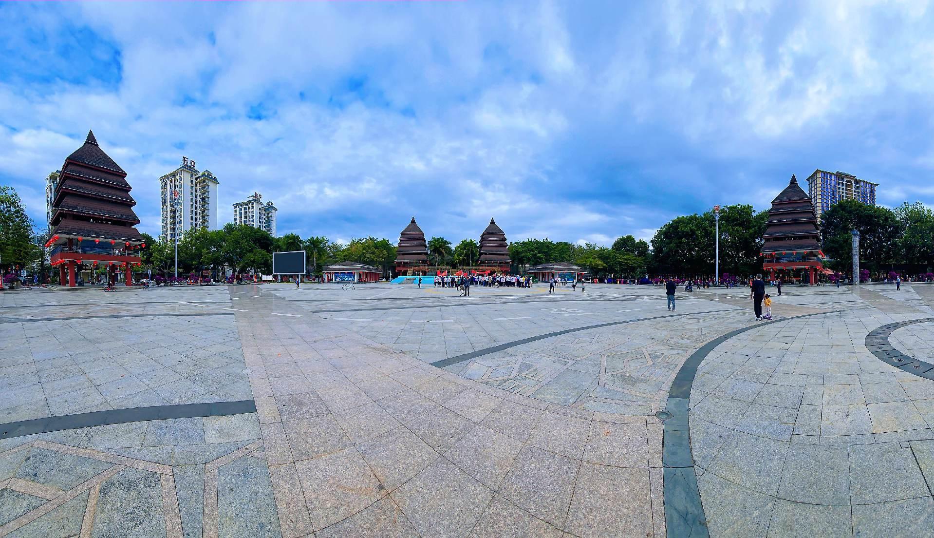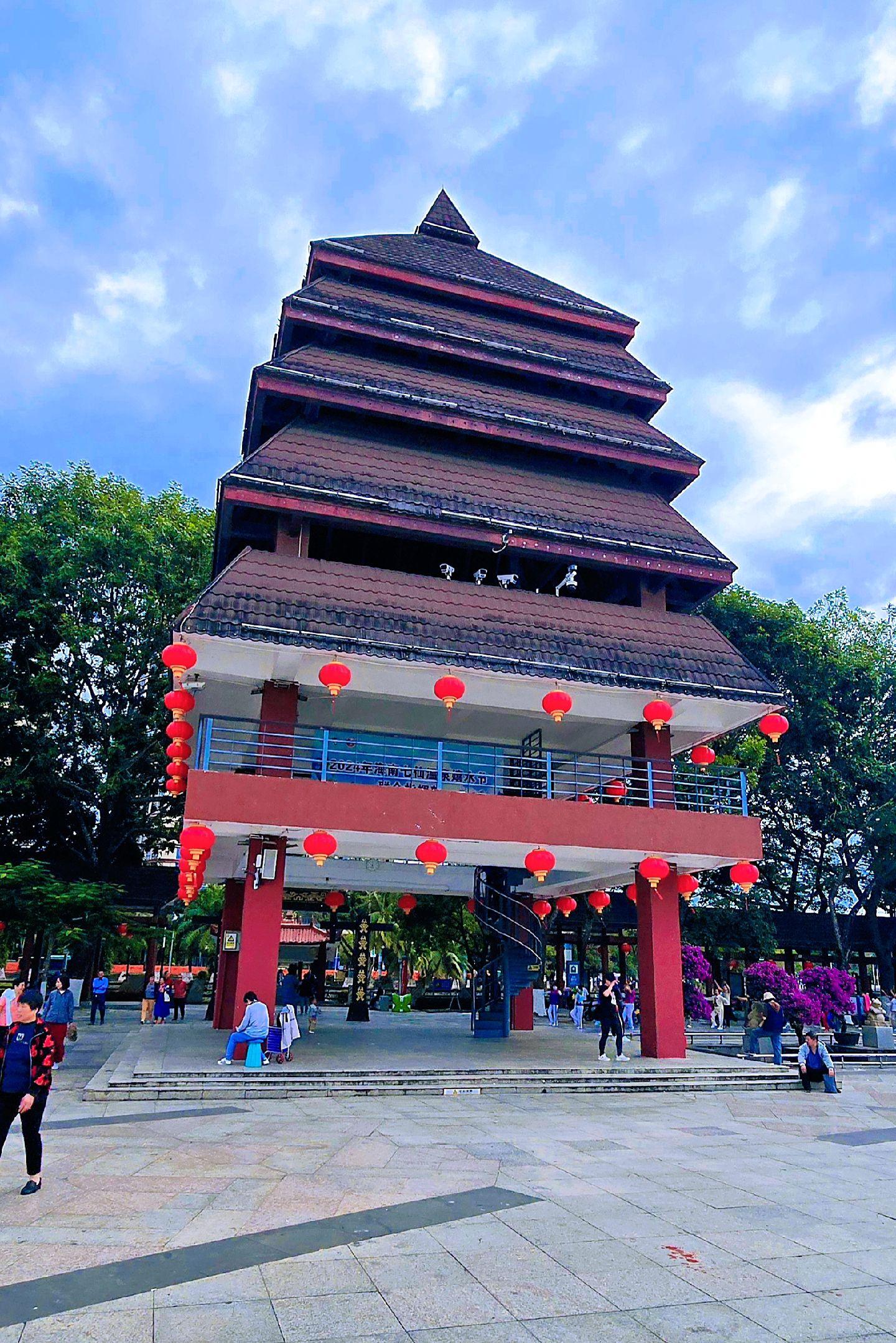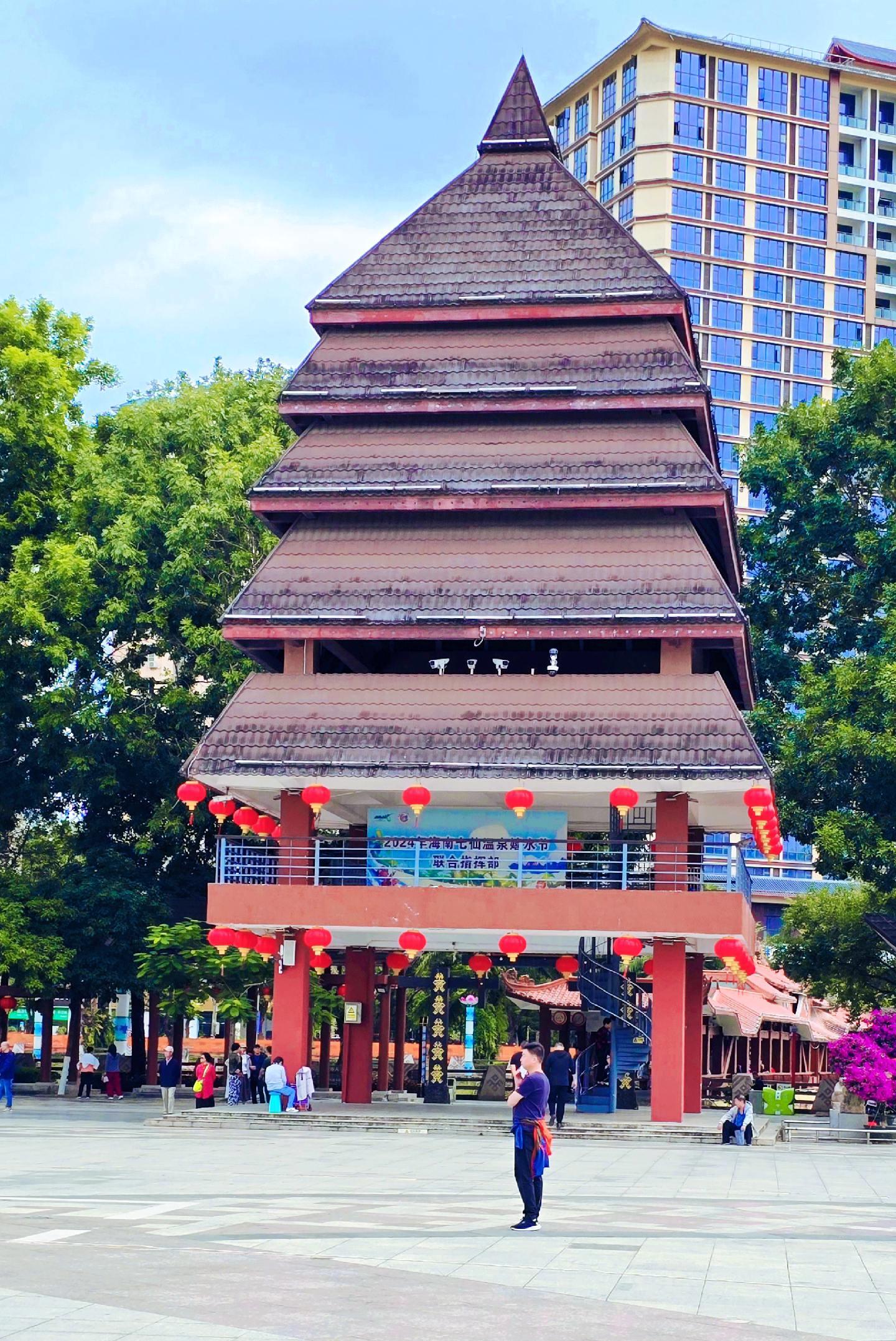 海南保亭七仙广场。七仙广场位于保亭县城东面,依山傍水,风光秀丽。广场环绕着七仙河,远处的七仙岭隐约可见,总面积约6.3万平方米。七仙广场于2005年8月建成,以其独具特色的亭阁建筑、凝聚民族文化的旺蛙雕塑和黎苗图案,吸引着全国各地游客前往休闲娱乐。它是一个集庆典活动、市民娱乐、旅游观光为一体的公共场所。