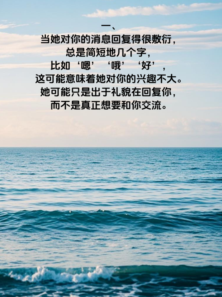 一、当她对你的消息回复得很敷衍,总是简短地几个字,比如‘嗯’‘哦’‘好’,这可能意味着她对你的兴趣不大。她可能只是出于礼貌在回复你,而不是真正想要和你交流。 二、在聊天过程中,如果她总是主动结束话题,或者很少主动发起话题,那么她对你的好感度可能不高。一般来说,喜欢一个人会想要和他多聊一些,分享自己的生活和想法。而她如果不愿意这样做,就说明她对你的关注度不够。 三、观察她在聊天中的态度,如果她总是很冷漠,对你的话题不感兴趣,甚至会表现出不耐烦的情绪,那么她肯定不喜欢你。真正喜欢一个人,是会被他的话题所吸引,并且愿意和他一起探讨的。如果她对你的话题毫无反应,那就说明她对你没有感觉。