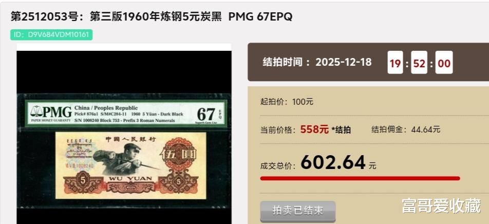 在2025年12月18日的“现代钱币拍卖会”中,一张PMG评级67分(带EPQ),第三版1960年“炼钢5元”(炭黑版),最后拍出了602.64元。