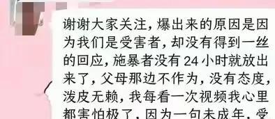 太可怕了!从电梯的监控画面可以看到这个男孩一进入电梯就开始打量起这个小女孩,似乎看到小女孩是独自一个人,没有大人的随行,立刻就上手捂住了小女孩的脸部,小女孩一开始还试图挣扎两下,无奈自己人小,根本就不是这个十四岁男孩的对手,怎么可能挣脱得了,很快小女孩躺在地上不动了,似乎已经晕厥!紧接着这个14岁的男孩子把电梯按到了1楼,然后抱着小女孩出去了,要不是在出电梯后途中遇到了路人,男孩因为比较紧张,惊慌失措,可能也有一点害怕路人的打量吧,于是直接把小女孩放住,自己逃走了走了! 随后女孩的家长报了警,但是令人意想是,2号晚上9点事发,3号凌晨4点被带走,因为是未成年人,下午被叔叔送回家,4号上午又被带走。家长发了文,施暴者24小时不到就放出来了,而且男孩那边的家长完全不作为,根本没有态度,泼皮无赖!很快,男孩的家长也在业主群里狡辩说,他们家孩子平时不这样,一直都是好好的,那天跟中了邪似的!把自己孩子的犯罪行为归纳成自己孩子中了邪,这也是滑天下之大稽,可笑至极呀! 怪不得有什么样的孩子背后就有什么样的家长!这已经不是所谓的熊孩子了,这就是一个潜在的炸弹,一个隐藏的恶魔啊,今天他敢对这个7岁的小女孩下手,那明天他就敢对另一个8岁的小女孩下手,谁还敢放心让自己的孩子单独乘坐电梯,甚至连出门都不敢出,有这样的一个风险人物在身边,大家随时都是提心吊胆。结果男孩家长还说,如果他出来了就把他送走,难道送走,他就不会在另一边祸害另一方的人吗? 现在的孩子因为生活条件好,大多数14岁已经长得跟成年人没有什么两样了!很多时候十一二岁的孩子比成年人还长得牛高马大,而且由于信息的高度发展,现在的孩子接触的东西比以往任何一代的人都要密集,都要集中,别说他们天真无邪的,很多孩子懂得比大人的懂得还多! 所以未成年犯罪法年龄真的需要重新划定呀!18岁作为未成年犯罪的一个年龄界限,显然已经不适合现在的孩子的犯罪年龄界定。 青少年犯罪幼龄化,犯罪手法极端化,刑事案件多发法,已经是现在的一个大问题,希望相关的部门能够好好重视未成年犯罪,未成年人保护法保护的是受害的未成年人,而不是保护的犯罪的未成年人! (视频图片来自网络侵删)