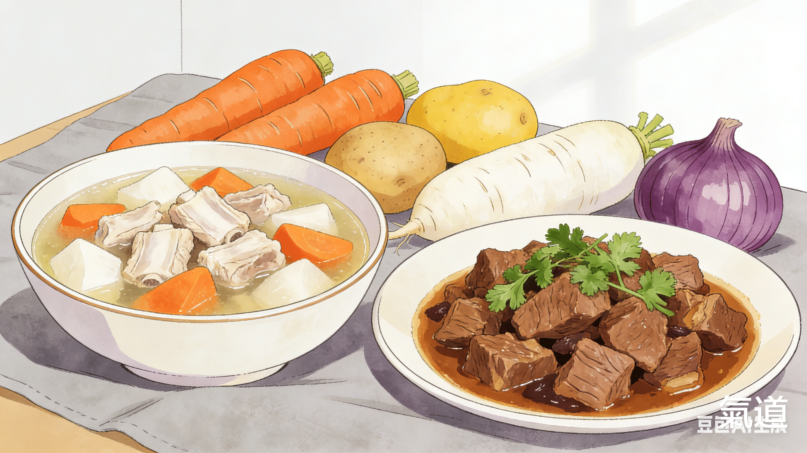 2. 多吃温补食材:日常饮食中可以多吃羊肉、牛肉、鸡肉等温补肉类,搭配萝卜、山药、红薯等根茎类蔬菜,既能补充营养,又能驱寒暖身。比如炖一锅羊肉萝卜汤,肉质软烂、汤汁鲜美,冬天喝再合适不过。