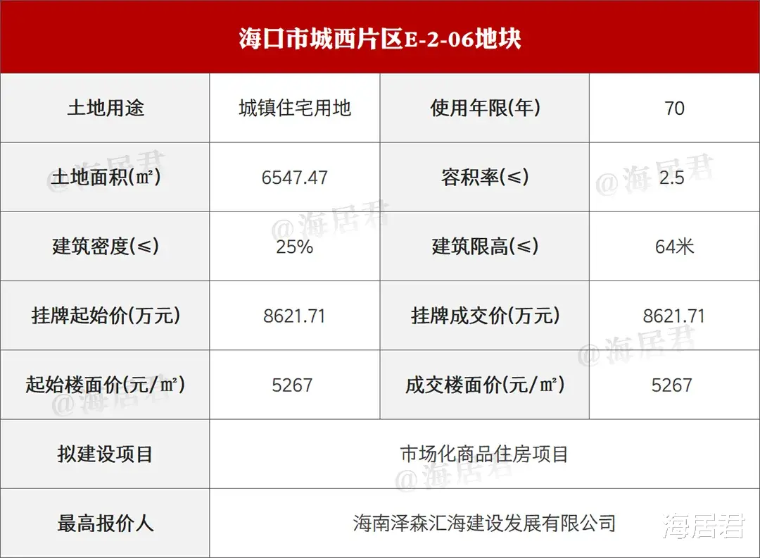 刚刚,海口土拍成交主城区城西片区E-2-06地块,这是今年海口土拍成交的首宗城镇住宅用地。