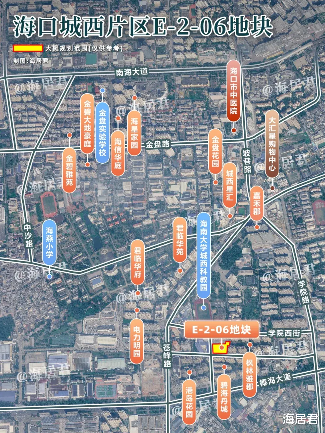 城西片区E-2-06地块区位相对不错,位于海南大学城西基础教学部南侧,北邻学院西街,东侧是枫林雅郡小区,南侧是海马二横路,西侧也是待开发空地。