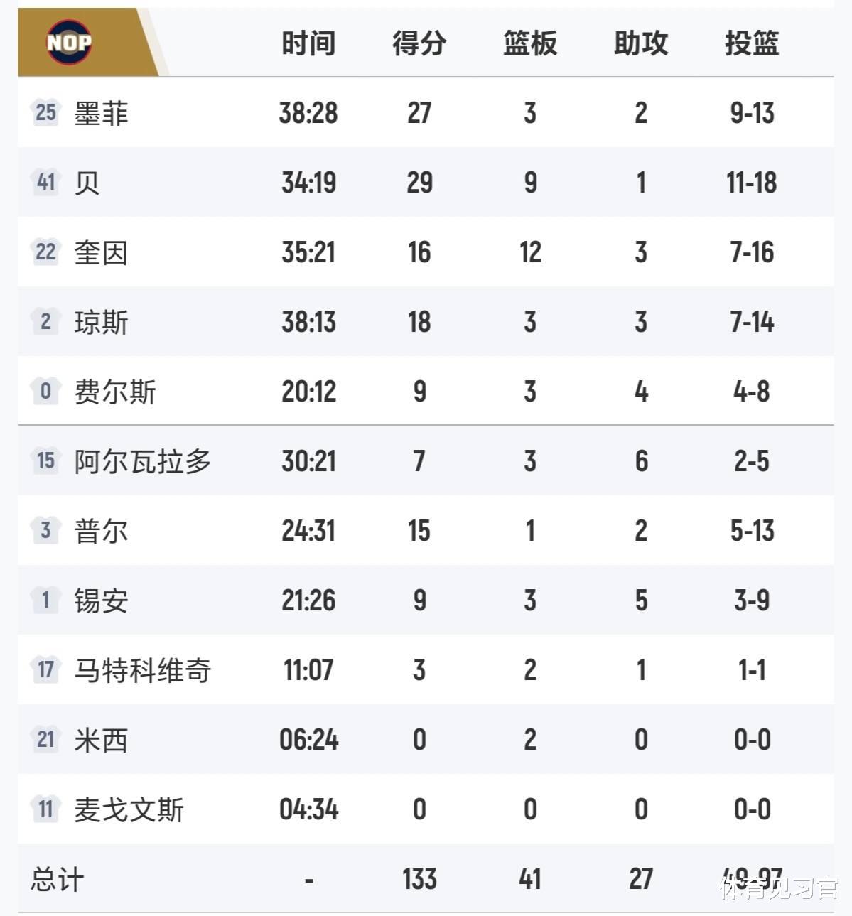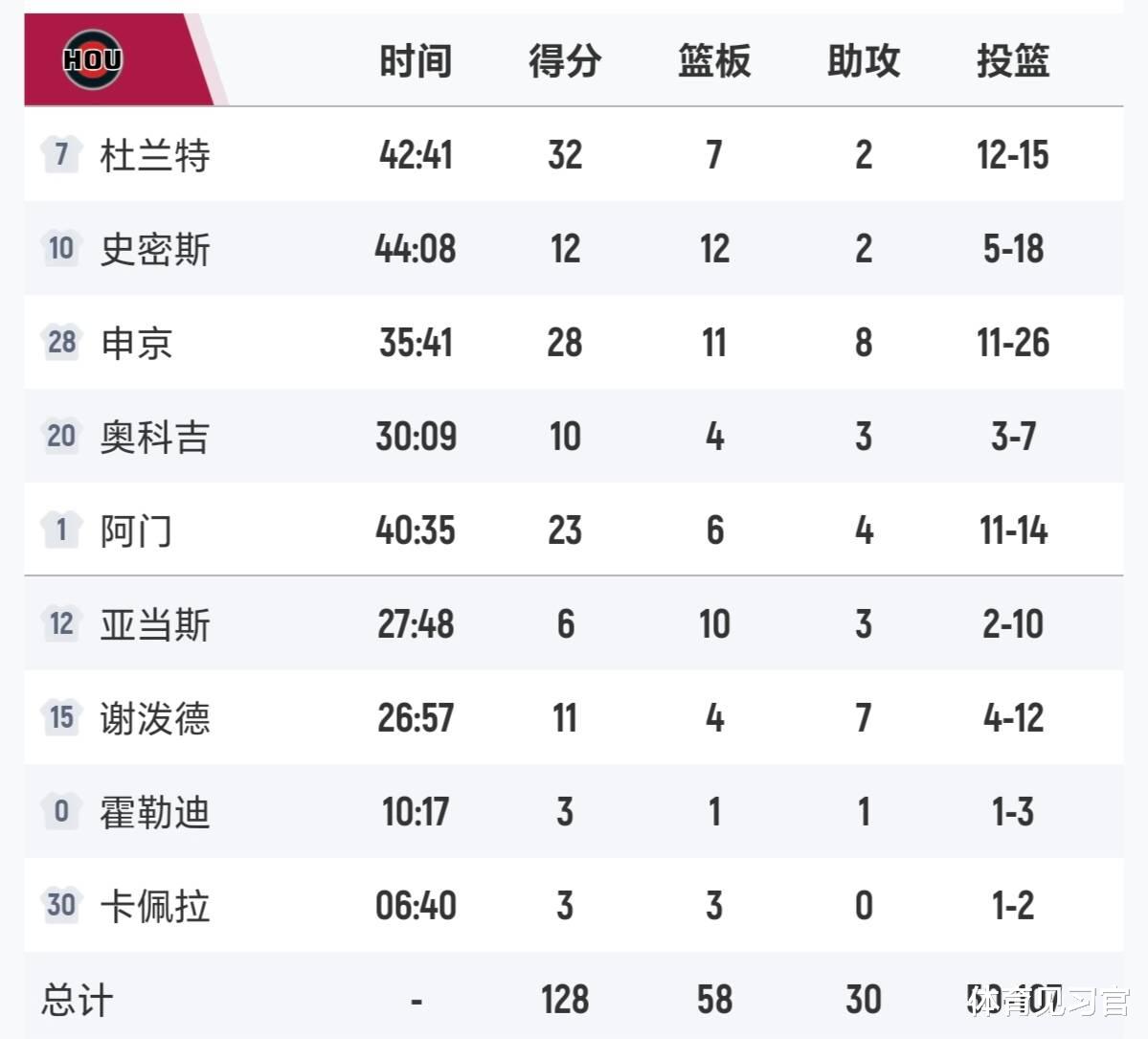 此役杜兰特延续高效表现,全场15投12中轰下32分7篮板4盖帽,其中半场7投全中,包揽4记三分砍下18分,生涯第三次达成半场百分百命中率且得分18+的成就。申京也贡献28分11篮板8助攻的准三双数据,阿门·汤普森入账23分6篮板,三人合力撑起火箭进攻。但这样的火力输出,终究没能抵挡住球队末节的崩盘。
