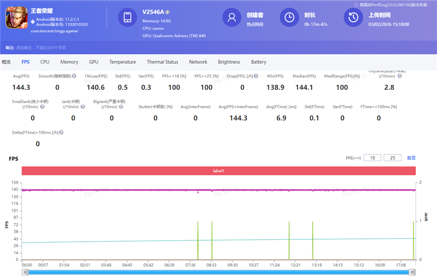 测试结果显示,iQOO 15 Ultra的平均帧率可以达到144.3fps,而1%Low帧则是140.6fps,游戏的平均功耗为3.4W,无论是整体流畅度、稳定性还是功耗的表现,都非常优秀。