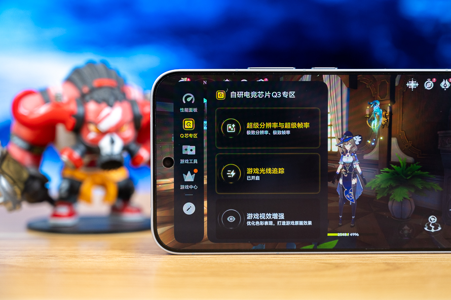 此外手机还搭载自研电竞芯片Q3,除了有超帧超分功能的加持,这一次Q3还带来了全自研全场景游戏光追,在《原神》《绝区零》《无限暖暖》等游戏中,已经可以带来全场景光追显示效果。