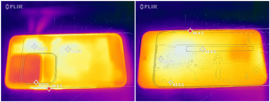不过在游戏中,得益于主动散热风扇以及超大的VC均热板,手机的机身温度倒是没我想象中高,实测手机最热出现在边框约为46℃,而机身正面背面则是在45℃左右,这完全是我可以接受的手持机身温度。