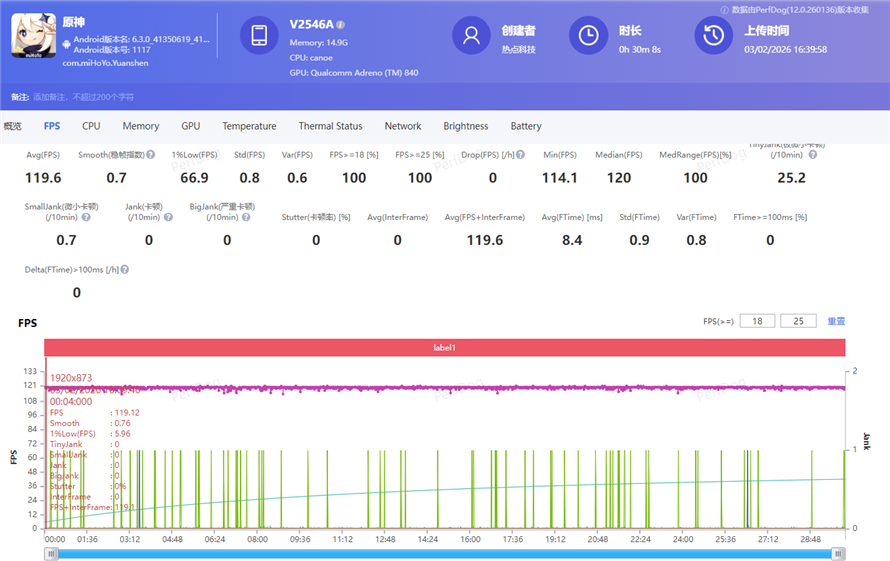 我们连续测试30分钟游戏内跑图,令我没想到的是iQOO 15 Ultra竟然全程无卡顿,游戏内平均帧率达到了119.6fps,1%Low帧为66.9fps。由于超分超帧以及光线追踪压力增大,游戏的平均功耗来到了6.5W。