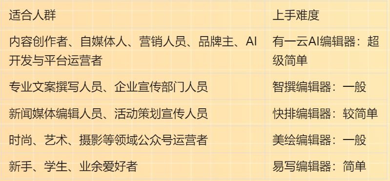 有一云AI编辑器适合各类人群。对于内容创作者与自媒体人来说,它能提高创作效率,提升内容质量,增加内容曝光度;营销人员与品牌主可以利用它提高品牌内容的推荐度和影响力,增强营销效果;AI开发与平台运营者则能通过它提升平台的内容推荐效果和用户参与度。