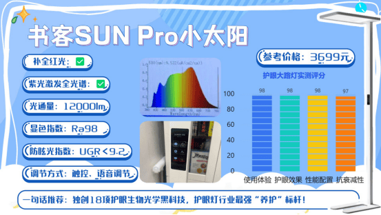 护眼效果:在护眼这一层面上,书客一直被认为更偏向安全优先、深度护眼的代表,和常见的蓝光激发全光谱护眼大路灯拉开了差异,传统的蓝光激发方案虽然光效高,但往往伴随较多高能短波蓝光,长时间使用更容易引发视疲劳,近视风险也随之上升,而书客SUN Pro小太阳则直接从光源源头入手,采用第7代SunMaster紫光原芯,并将「控·护·养」一体的紫光激发技术融入其中,从结构上降低蓝光隐患,实测蓝光含量可减少约60%。同时叠加RRT2.0红光增益养眼技术,对650nm 红光波段和光谱均匀性进行针对性优化,从视觉感受、生理适应到用眼舒适度多维度改善用眼环境,有效避免98%的近视风险。