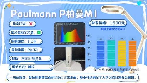 护眼效果:在护眼表现上,柏曼采用的是紫光激发的全光谱方案,通过光源端对蓝光进行重新调校,使整体光谱分布更加平衡,其蓝光峰值被控制在RG0安全等级范围内,需要注意的是,这款灯在红光波段的表现相对中规中矩,光谱连续性一般,并且未补全红光,此外,显色指数约为Ra97,能够满足日常阅读和书写等基础照明需求。