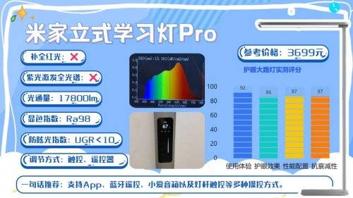 护眼效果:米家这款在光源配置上使用了666颗全光谱LED灯珠,并采用蓝光激发架构,在保证亮度的前提下对蓝光比例进行了控制,实测蓝光峰值约在0.6左右,处于相对安全的区间,整体光谱连续性表现比较稳定,观感偏自然柔和,显色指数同样保持在较高水平,Ra98+对纸面细节和色彩还原都比较友好,需要注意的是,这款并未针对红光做额外补全,因此在护眼深度上,相比具备红光增益方案的全光谱灯型,会略逊一筹。