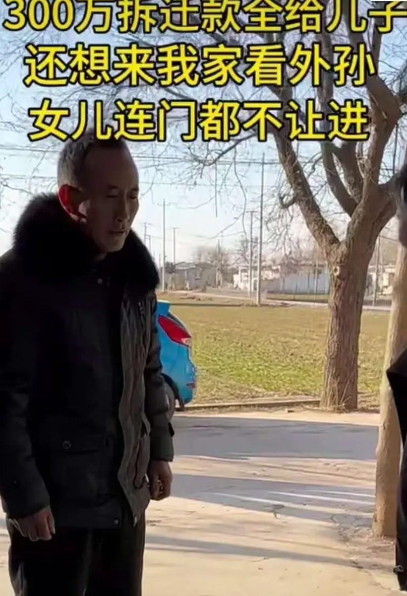 300万拆迁款全给儿子,女儿连家门都不让进。 这位父亲过年拿着礼物去看外孙,女儿却连家门都不让老父亲进。还扬言说:走走走,以后都不要来我家,你也没有外孙。 原来这位父亲的房子被拆迁,赔了300万,他把这些钱全部给了自己的儿子,女儿一分也没有给,眼看着过年了,于是提着礼物去女儿家看外孙,却连女儿家门都没有进去,就被赶走了。 不仅没有进女儿家,就连拿的礼物都被扔了出来,父亲无奈只能落寞的转身离开。 女儿的做法,也是伤透了老父亲的心。 有网友指责这位父亲的做法不对;现在的儿子和女儿一样,都要赡养老人,拆迁款理应有女儿的一份。 也有网友支持父亲的做法;自古就有嫁出去的女儿泼出去的水这一说法,女儿出嫁后就是外人了,哪有还分拆迁款的道理。 对此,你怎么看?出了嫁的女儿在面对娘家拆迁,应不应该分钱?