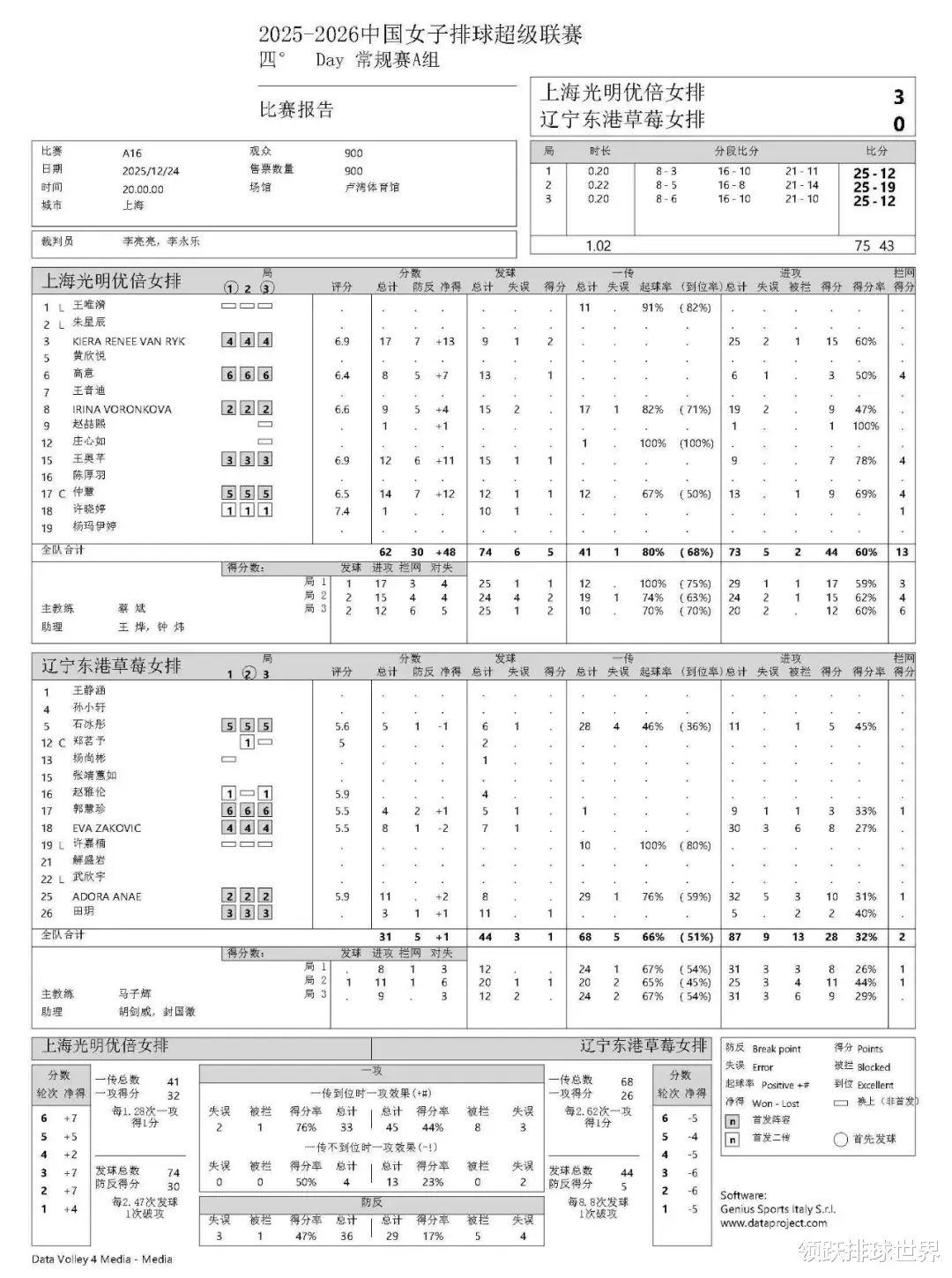 北京时间12月24日,上海市卢湾体育馆上演了一场实力悬殊的对决。2025-2026赛季中国女排超级联赛常规赛A级第四轮,上海光明优倍女排在主场以干净利落的3比0横扫辽宁东港草莓女排,三局比分分别是25-12、25-19、25-12,至此,上海队豪取四连胜,继续不败领跑积分榜,而辽宁队则苦吞四连败,陷入积分垫底的困境。