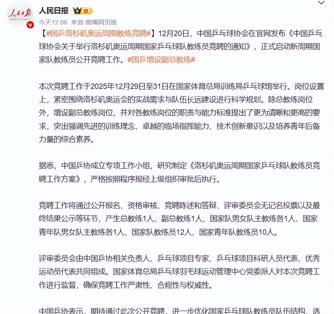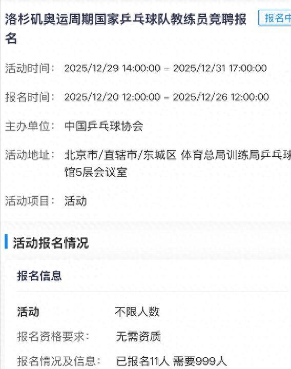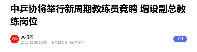 12月20日,中国乒协公布了国家队教练员的竞聘岗位和条件。