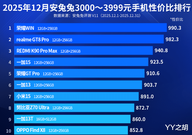 具体来说,在2025年12月安兔兔3000—3999元手机性价比排行榜中,荣耀WIN和realme GT8 Pro分列第一名和第二名。在安兔兔平台上,这两款智能手机的性价比评分分别为990.3分和982.3分。其中,荣耀WIN系列定位为荣耀全新电竞系列,深耕游戏人群,理念为‘不止加速,更要稳赢’。首款产品被定义为‘年度电竞夯机’,搭载第五代骁龙8至尊版旗舰芯和荣耀东风涡轮散热系统。