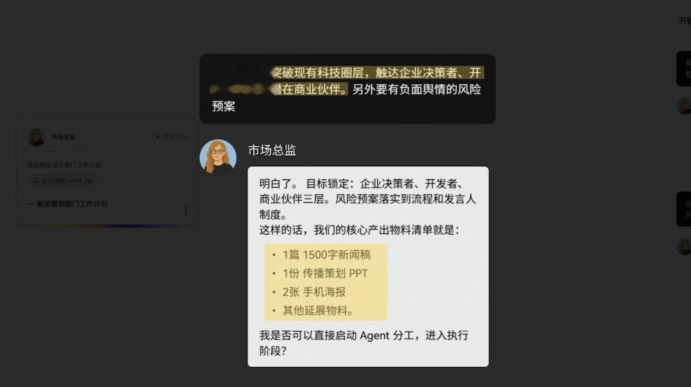 其一是“发布会策划”。用户仅需输入一句需求Prompt,系统即激活“市场总监”主智能体,负责拆解顶层任务目标,并快速规划出包含文案、视觉设计、媒介统筹等子任务的工作流。