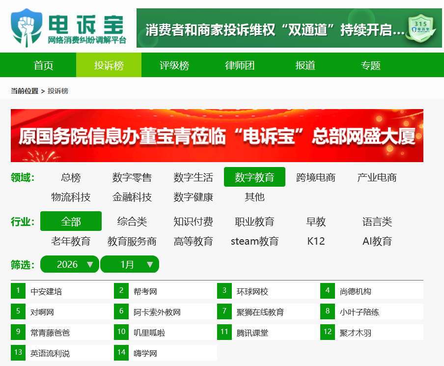据网络消费纠纷调解平台“电诉宝”显示,2026年1月,“电诉宝”受理投诉中涉及的数字教育平台按投诉量依次为:中安建培、帮考网、环球网校、尚德机构、对啊网、阿卡索外教网、聚狮在线教育、小叶子陪练、常青藤爸爸、叽里呱啦、腾讯课堂、聚才木羽、英语流利说、嗨学网。