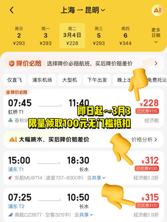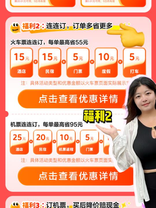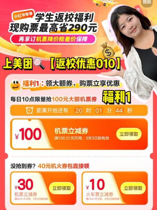 开学季又要到了,是不是准备购买返校的机票和火车票了? 美团有活动,学生返校购票最高省290元。有需要的宝宝赶紧领一下。能省一点是一点🎉 - 在美团搜索【返校优惠010】,进入学生返校购票活动专区 ☝️【福利1】:领取大额劵,购票立享受优惠。机票/火车票都有立减优惠劵。 ✌️【福利2】:连连订,订单多省更多。 👌【福利3】:订机票,买后降价赔现金。 除了这些在活动开始~3月3日期间,每日可以限量领取大额100元机票优惠券,满100.01元直接立减。 每天早上10点准时开抢!