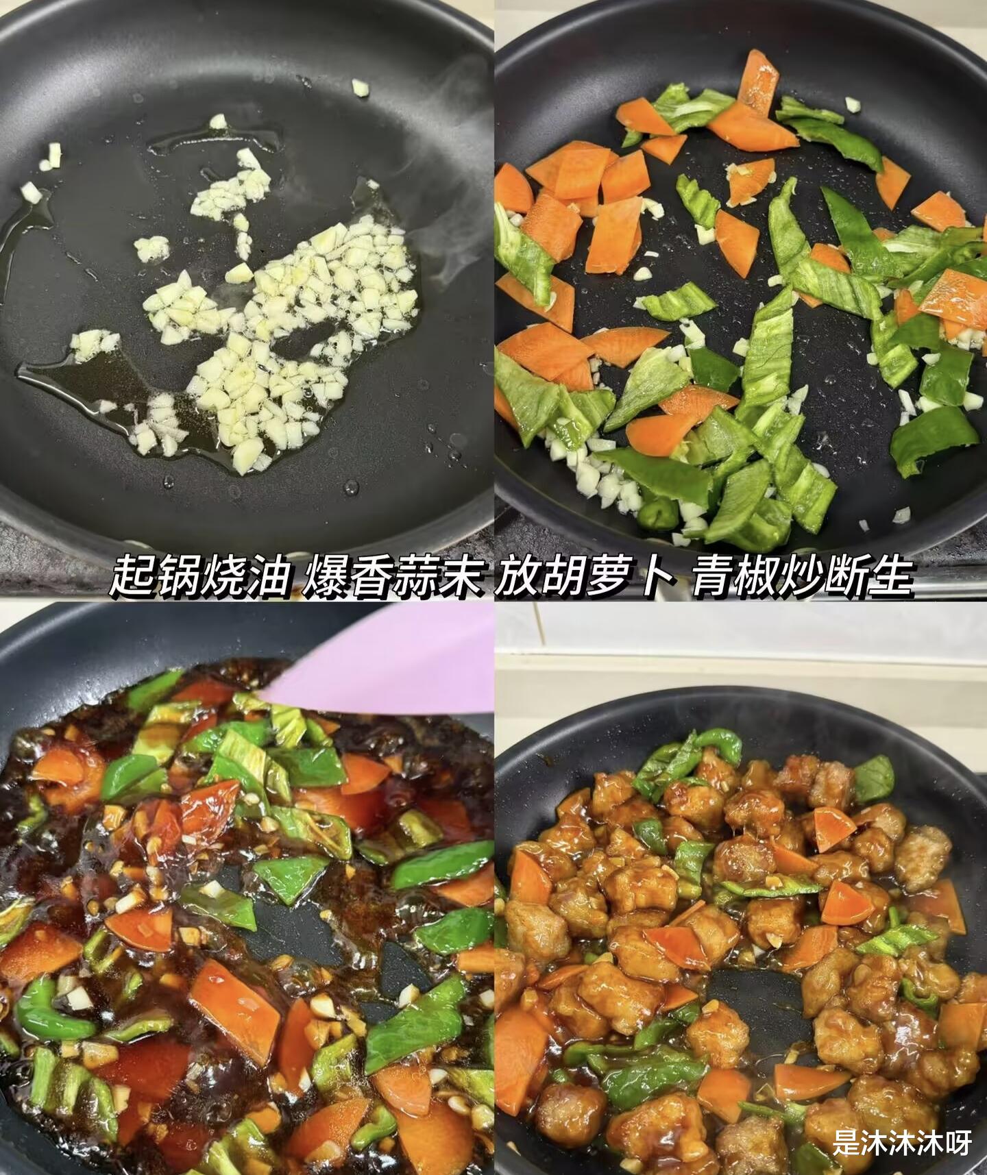 锅里留少许底油,爆香姜蒜末,然后倒入配菜,大火快炒几下。倒入调好的碗汁,用铲子快速画圈搅拌,直到汤汁变得浓稠,冒起大泡泡。赶紧倒炸好的肉段,离火快速翻炒。整个过程要快,不超过15秒,然后立刻出锅装盘!