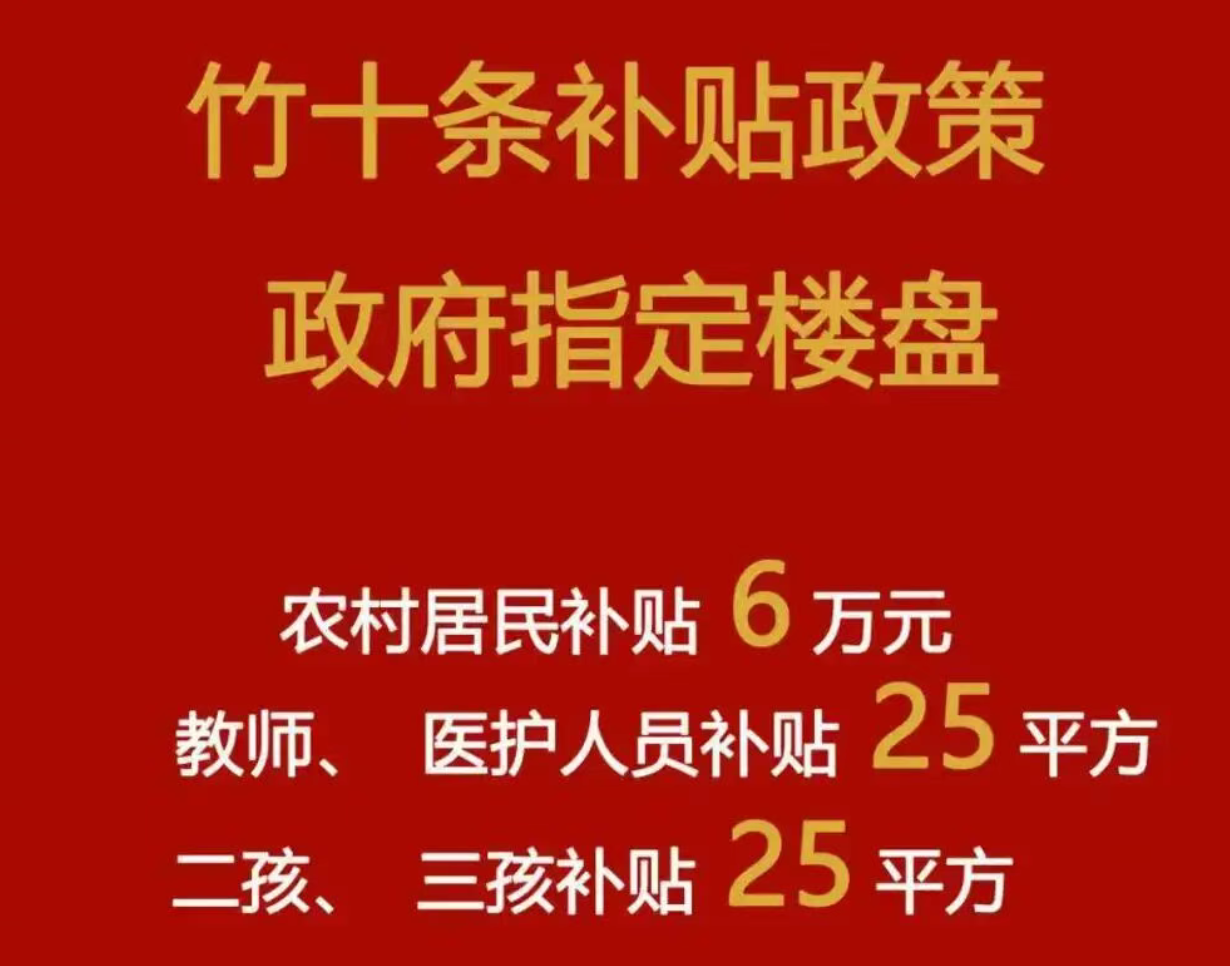 由于竹山县网上的信息比较少,查了一看,找到一个竹十条补贴政策政府制定楼盘,根据公开优惠信息显示,该盘分别给予农村居民补贴6万元,教师、医护人员补贴25平方,二孩、三孩补贴25平方。