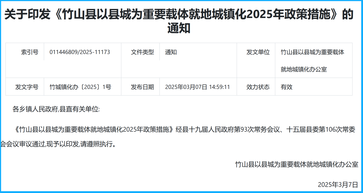 今年3月7日发布的《关于印发《竹山县以县城为重要载体就地城镇化2025年政策措施》的通知》中,再次提到: