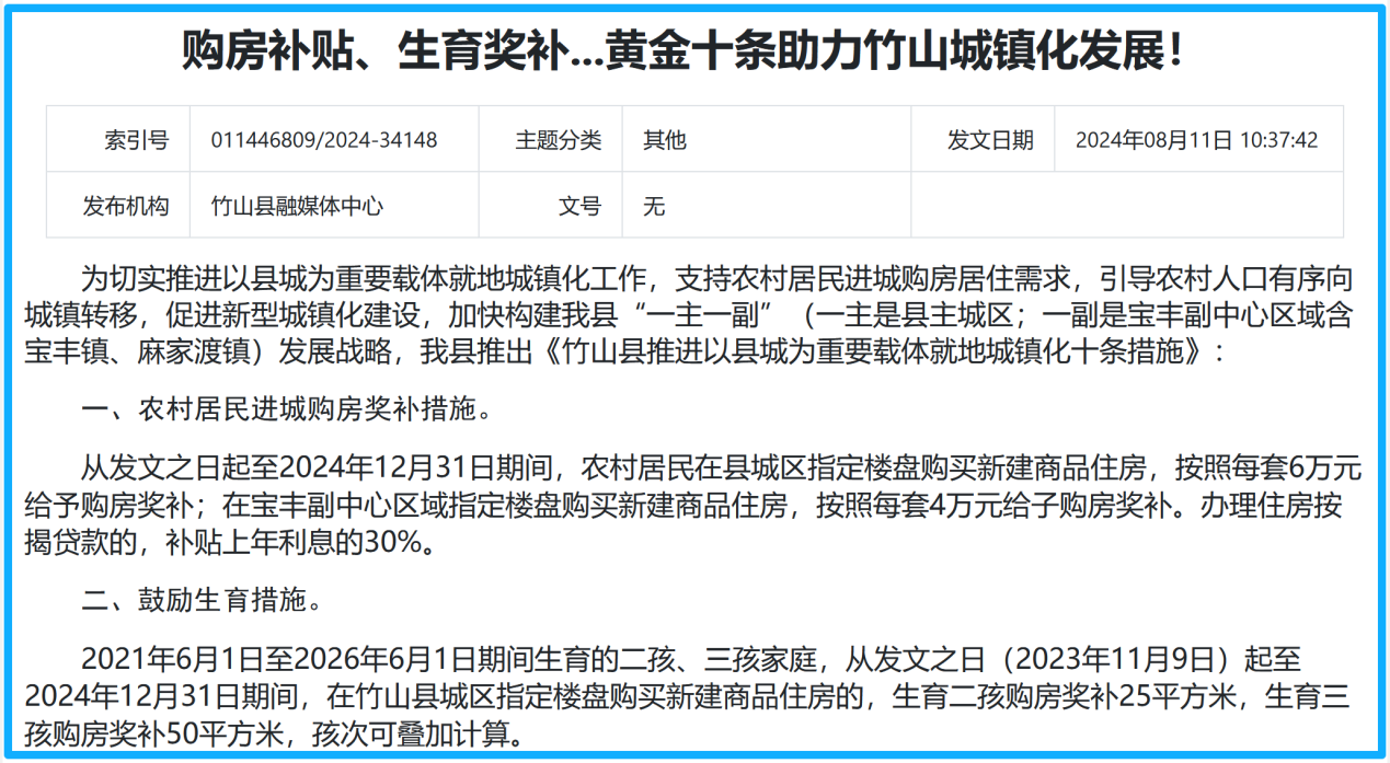 通过查询得知,这个政策并不是最近才发布,因为网友晒出了奖励资格凭证才被广泛关注。最先出现是在当地2024年8月11日发布的《购房补贴、生育奖补...黄金十条助力竹山城镇化发展!》文件中。