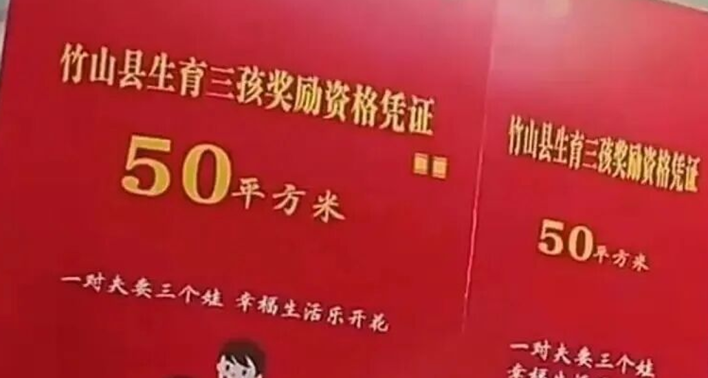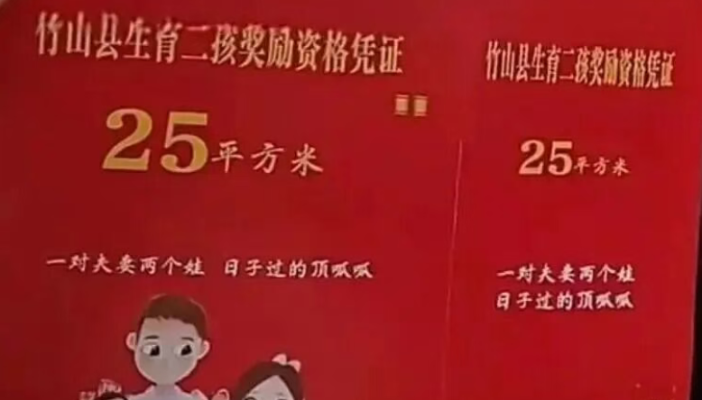 “自2021年6月1日起至2025年12月31日,夫妻一方属竹山户籍且生育二孩、三孩家庭,在竹山县城区指定楼盘购买新建商品住房的,生育二孩购房奖补25平方米,生育三孩购房奖补50平方米,孩次可叠加计算。”