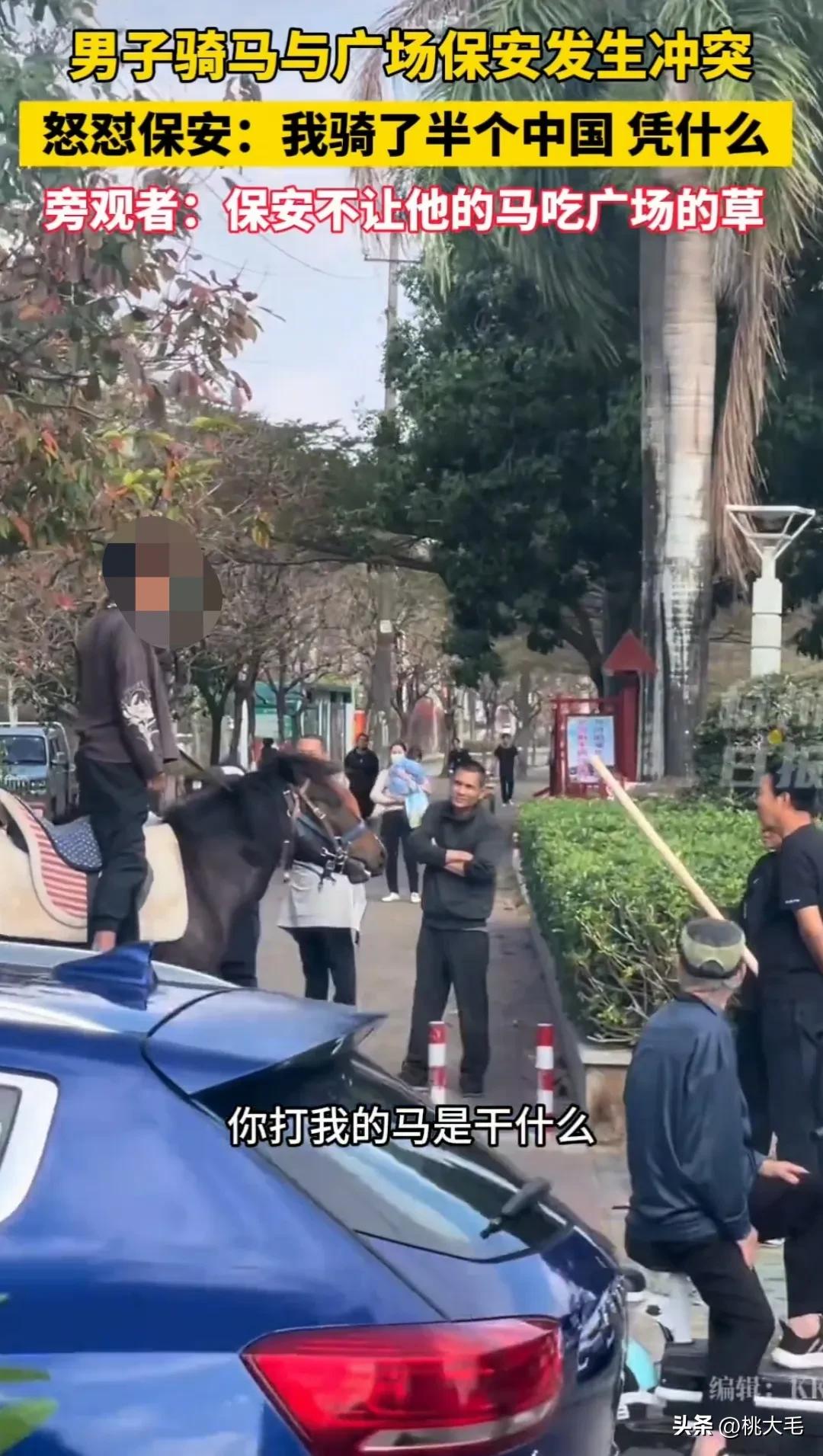 近日,广西有个人牵着马在广场啃草,保安拿根棍子吓唬马,结果马主人直接炸毛了:你敢打我的马试试? 两个人对着吼得比菜市场还热闹。 只见马的主人在马背上站了起来,语气有点凶,说:我的马怎么了,我在广场吃草不行?广场是你家的吗? 保安不甘示弱,说:广场是国家的,并且让同伴报警。 骑马男子不依不饶,说:是国家的就对了,谁给你的权利?我骑马走了大半个中国,就你们省会这样。 这条视频发到网上引起了很大的争议,争议的内容就是马吃广场的草到底对不对? 按理说广场是公共区域属于国家,就跟咱家客厅似的,谁想来蹭饭得先问过主人同意不?《城市市容环境卫生管理条例》里白纸黑字写着禁止在绿地放牧,这规定就跟"不准在火锅店吃火锅蘸蒜泥"一样清楚明白。 可话又说回来,马这种牲口跟猫狗不一样,你让它跟人类一个起跑线遵守规则是不是有点强人所难?你看小区里遛狗的还总有人不管牵引绳乱窜呢,真要较真起来估计得逮走一半狗子。 马主人叼着根草茎在监控镜头前怼:"我走过大江南北都没人敢拦!"这话乍一听确实让人害怕,但仔细一想就漏洞百出——你见过哪个国家允许游客在市中心广场喂马的?去年我去内蒙古旅游,草原上骑马啃草那是正经的民俗体验,可那是在景区规划的草场里,跟闹市区的大马路能比吗? 最逗的是网友们的神评论。有人发了个段子说:"建议给马办个绿卡,毕竟吃草算不算环保行为啊?" 不过说正经的,要真让马在广场肆无忌惮吃草,保不齐哪天牛羊组团来开联谊会,那场面可比广场舞还热闹。 要说这事儿到底谁对谁错,我觉得就像老太太们抢超市鸡蛋——都有理。但话又说回来,规则这东西就像村口的老槐树,不能随便砍,但偶尔也得修修枝桠。与其纠结马能不能吃草,不如想想怎么在人和动物之间找个平衡点。比如在郊区建个生态公园,专门让马儿们撒欢,既满足情怀又保护环境,这不比在广场上较劲强?