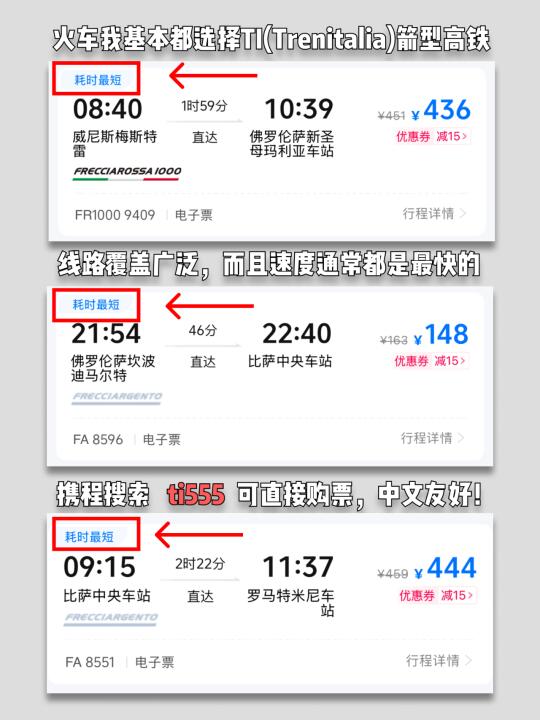 意大利境内的火车我都选择的是箭形高铁,线路覆盖全面,速度通常也都是最快的,而且车厢内部感觉舒适。对于假少的打工人真的很合适。不过我们怎么购买呢?其实可以在携程上搜索【ti555】就可以进入到欧洲火车票购买首页,对于自由行&外语不太灵光的我们特别友好,全部都能看懂!而且实时更新检测自动使用折扣码,无需额外寻找折扣码。