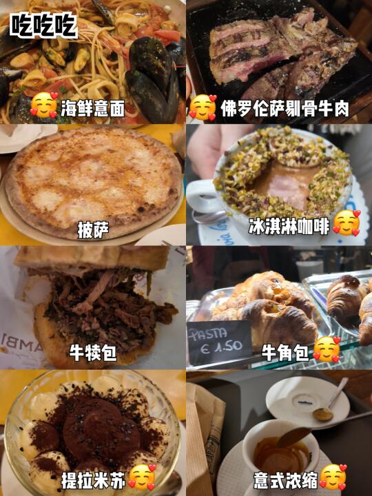 牛肚包、墨鱼意面、海鲜意面、剔骨小牛肉、冰淇凌、披萨、意式浓缩