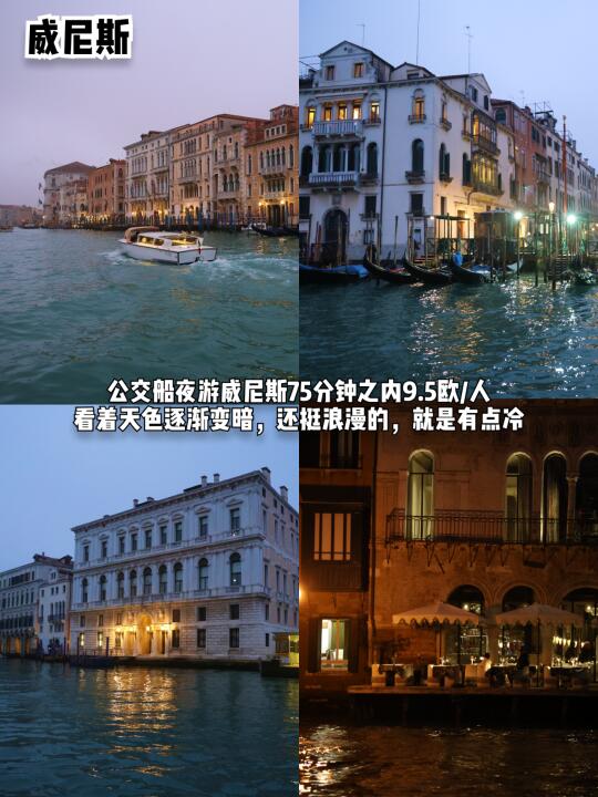 乘公交1.5€到达主岛→赤足桥→叹息桥→圣马可广场→公交船夜游→主岛坐公交→火车站→酒店附近超市买早饭
