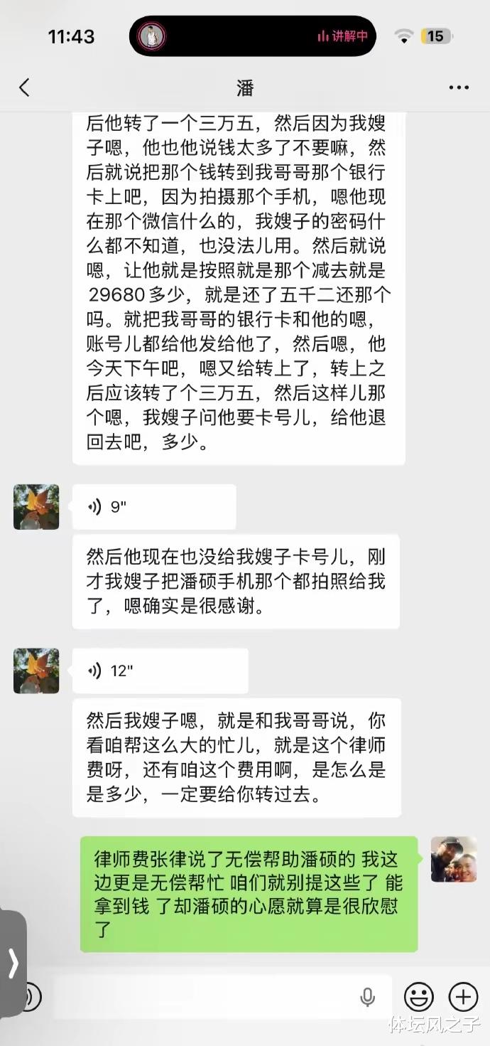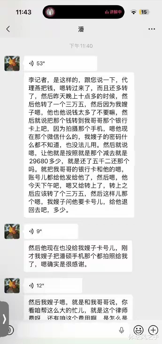 不过,事情在12月20日出现了转折。当晚,李平康发文称戴琳已将拖欠的剩余钱款归还给了潘硕的家属,而且多给了5000多元。据李平康介绍,按照约定戴琳本应在19日还钱,19日晚10点在潘某家人追问下,他先微信转账35000元,后因潘某家人不熟悉微信转账操作,便让戴琳撤回转至潘某父亲银行卡上。20日下午,戴琳完成还款,多还的5000多元家属想要退回,提出让戴琳提供账号转回,但截至目前戴琳尚未提供。