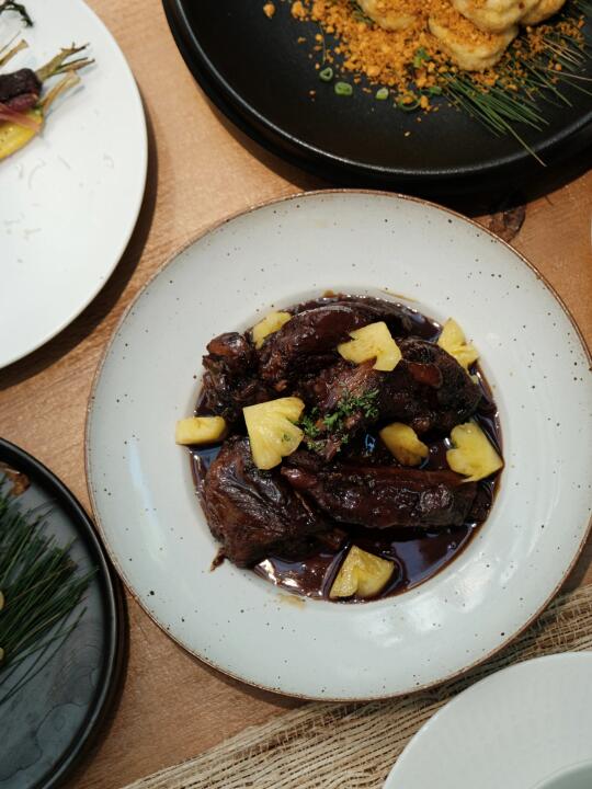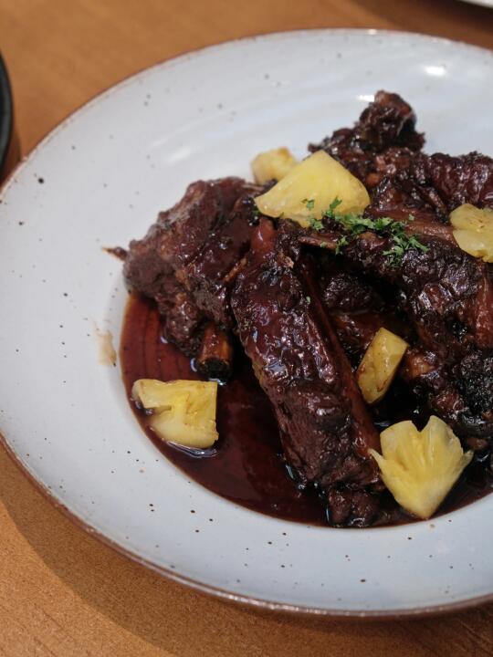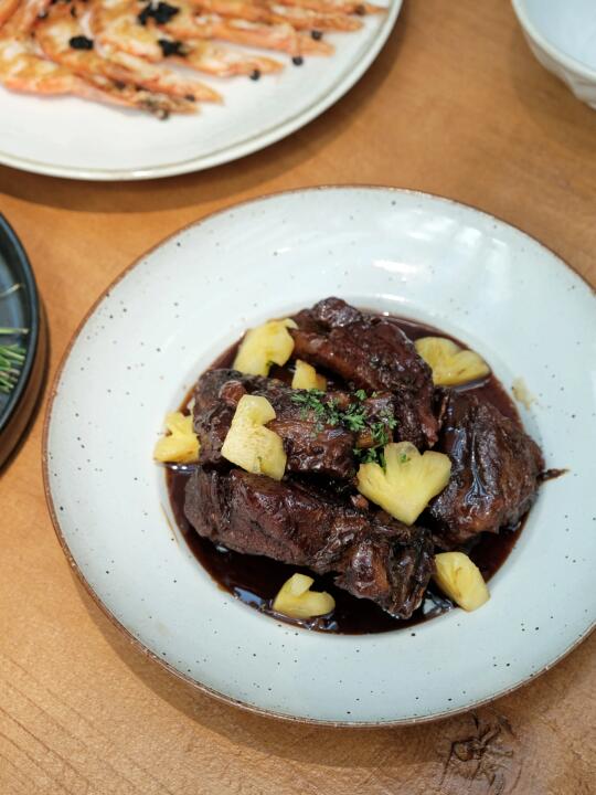 猪肋排采用糖醋的做法,搭配版纳小菠萝,既能解腻又增添口感,排骨炖的软烂,一秒脱骨