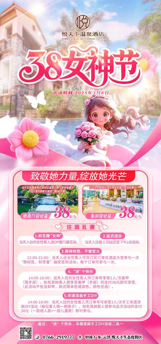 住酒店送哪吒观影礼包+女神专属折扣! 双重好礼叠加太!值!辣! 连吒儿都在喊"我的风火轮该升级了"! 收好这份3.8女神节优惠信息,千万别错过哦! – 👑「女神福利月」 🎫女神专属套票: 68元/套(原价218元,周末通用) 🍭哪吒2观影福利: 凭票根/购票记录享6折优惠 🌺「38女神节福利」 🎫温泉门票优惠:当天女性顾客购买森林谷温泉门票可享受钜惠价38元/人(同行男性顾客可享受门票8折优惠) 🍚自助餐优惠:当天女性顾客在酒店用自助餐可享受钜惠价38元/人 更多3.8节福利查看海报图哦~😋